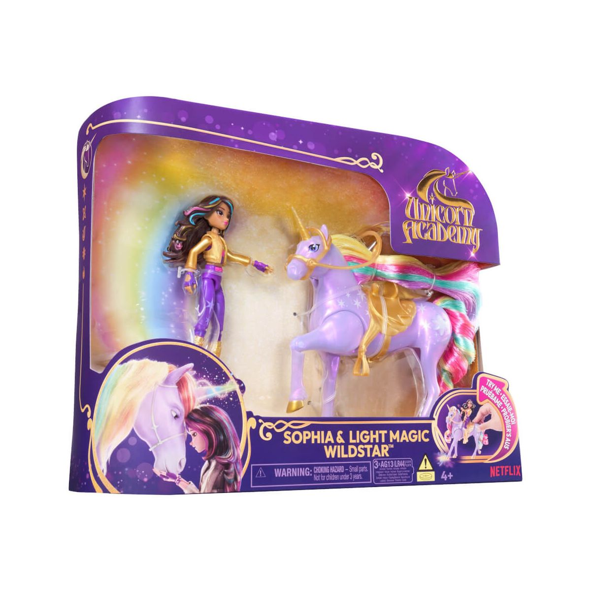 Es war einmal eine magische Insel weit hinter den blauen Meeren auf der es eine ganz besondere Schule gab, die Unicorn Academy. Auf dieser Schule werden bis heute Einhorn-Reiterinnen und -Reiter ausgebildet, die eine besondere Mission haben: den Zauber der Insel und damit den der ganzen Welt zu bewahren. Diese spannende Story, die auf einer Buchreihe basiert und in eine wunderschön animierte Netflix-Serie umgesetzt wurde, wird mit den Spielzeugen von Spin Master in den Kinderzimmern lebendig. Sophia, die Heldin der Geschichte, ist zunächst ein ganz normaler Teenager, bis sie eine magische Einladung erhält und sich auf der Insel in eine Einhorn-Reiterin verwandelt. Dort muss sie ihr seelenverwandtes Einhorn finden, dessen Vertrauen gewinnen und eine echte Verbindung zu ihm aufbauen, damit seine magischen Kräfte entfesselt werden. Dieser magische Moment wird mit Licht-Magie Wildstar und Sophia als 12 cm große Puppe immer wieder aufs Neue lebendig. Einfach auf den Stern an Wildstars Kruppe drücken, schon stampft sie mit dem Huf auf und projiziert regenbogenfarbenes Sternenlicht, das in der Geschichte sogar Regenbogenbrücken bauen kann. Damit alle Episoden der Serie nachgespielt werden können, sind auch Sophias Mitschülerinnen Ava, Isabel, Layla und Valentina mit ihren Einhörnern als 2er Sets erhältlich. Alle Puppen vollbeweglich und die Einhörner mit abnehmbarem Sattel und Zaumzeug, natürlich detailliert im Look der Serie..