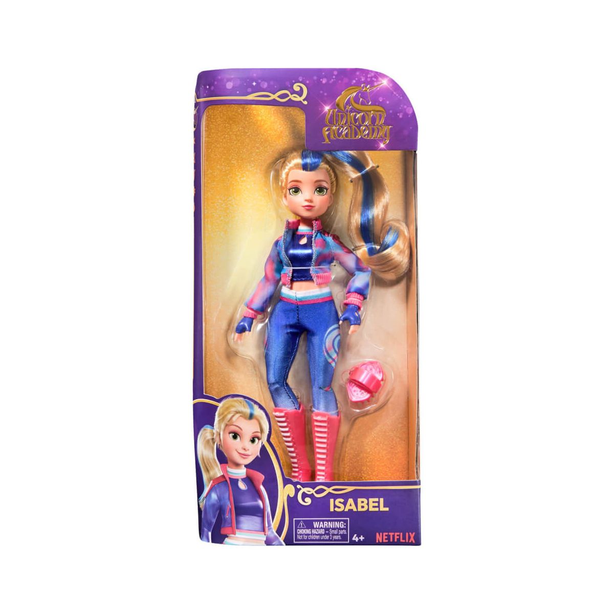 UCA Fashion Doll Isabel Kinder lieben Abenteuer, magische Welten voller Verwandlung und Fantasie sowie Fabelwesen. Aus all diesen Zutaten besteht die liebevoll animierte Netflix-Serie Unicorn Academy, die Kinder ab 5 Jahren begeistert. Mit den Spielzeugen der Firma Spin Master werden die Episoden im Kinderzimmer lebendig. Isabel als 24 cm große, vollbewegliche Ankleidepuppe gleicht dem Charakter aus der Serie bis aufs Haar. Und das ist wörtlich gemeint. Sie trägt in ihrem langen, blonden Haar ihre charakteristische blaue Strähne, die auf die Wasser-Magie ihres Einhorns River hinweist, das separat erhätlich ist. Doch einen Schritt zurück. Die Teenager auf Unicorn Island werden zu Einhorn-Reitern ausgebildet, doch zuerst muss das seelenverwandte Einhorn gefunden werden. Dass das auf den ersten Blick nicht immer zu einem zu passen sein, das erlebt Isabel hautnah. Während sie selbstbewusst, super sportlich und ehrgeizig ist, erschrickt ihr Einhorn schon mal vor seinem eigenen Schatten. Isabel als Ankleidepuppe trägt das original Reit-Outfit aus der Serie mit kurzem Top, gecroppter Jacke und Reithosen mit dem Wellenmuster ihres Einhorns. Dank ihrer 9 Bewegungspunkte kann sie Action-Posen einnehmen und auch auf ihrem Einhorn reiten. Neben Isabel sind auch Sophia und ihre Freundin Ava als 24 cm große Fashion Dolls separat erhältlich, ebenso wie ihre Einhörner. Inhalt: * 1 Ankleidepuppe 24 cm * 5 abnehmbare Bekleidungsteile * 1 Haarbürste Maße: 15,24 x 5,08 x 32,38 cm.
