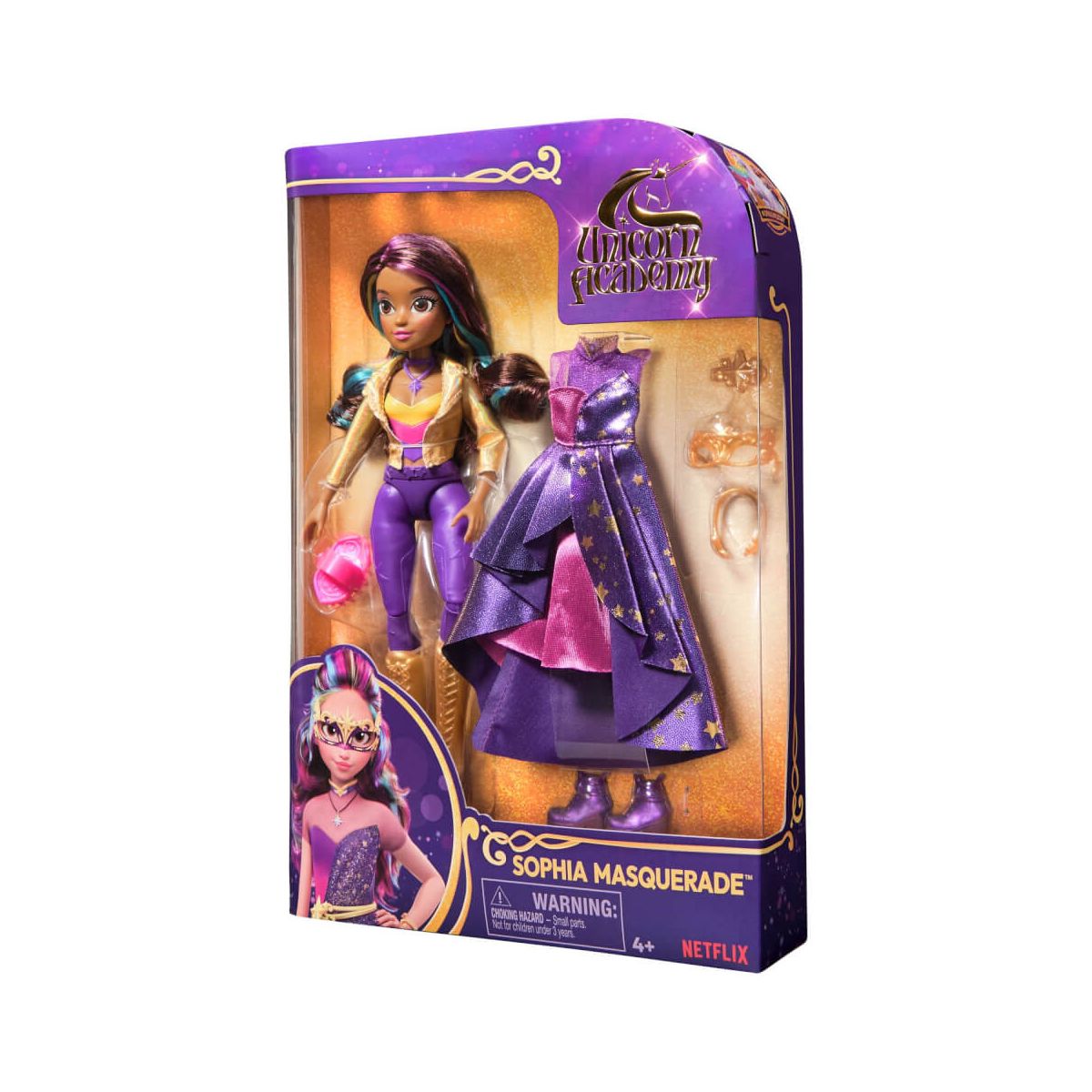 Mit diesem Set wird der Zauber der Flirrfeen auf dem Maskenball von Unicorn Academy, der gleichnamigen Serie auf Netflix, lebendig. Die Flirrfeen sind es auch, die Reiterinnen und Einhörner auf der Unicorn Academy zusammenbringen, den Einhörn Namen geben und den Reiterinnen, nachdem der Bindungszauber stattgefunden hat, ihre Reitoutfits passend zur Persönlichkeit des Einhorns verleihen. Mit dem Maskenball Set kann Sophia sich von der Reiterin in eine Ballkönigin verwandeln, die mit Abendkleid, Maske und Accessoires den geheimnisvollen Zauber der Insel lebendig werden lässt. Dank ihrer neun Artikulationspunkte kann sie die verschiedensten Posen einnehmen und nicht nur auf ihrem Einhorn Wildstar (separat erhältlich) reiten, sondern auch auf der Tanzfläche eine gute Figur machen. Ihr Haar mit den Regenbogensträhnen lässt sich zur Hochfrisur stylen, was ihr ein besonders elegantes Aussehen verleiht. Neben Sophia sind auch ihre Freundinnen Ava und Isabel separat als 24 cm große Ankleidepuppen in ihren Reiteroutfits erhältlich, ebenso wie ihre Einhörner Leaf und River. Damit können die spannenden Abenteuer von Unicorn Academy sowie eigene fantasievolle Geschichten immer wieder lebendig werden..
