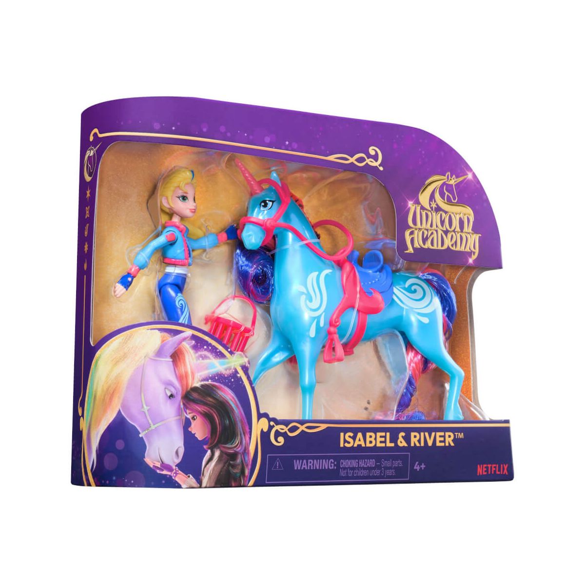 Wo echte Teenager auf magische Einhörner treffen, wo Regenbögen hinter Dunkel-Magie zu verschwinden drohen und und allerhand Fabelwesen auftauchen, sind spannende Abenteuer garantiert. Daher steht die Netflix-Serie Unicorn Academy bei Kindern und vor allem Pferde- und Einhornfans ab 5 Jahren besonders hoch im Kurs. Hier finden sie aufgrund der differenzierten Charaktere jede Menge Identifikationspotenzial. Mit den Unicorn Academy Reiterinnen und Einhorn Sets (alle separat erhältlich) werden die spannenden und humorvollen Geschichten zu Hause im Kinderzimmer lebendig. Die ca. 11 cm großen Puppen besitzen 7 Artikulationspunkte, damit sie auf ihren Einhörnern reiten und sämtliche Action-Posen einnehmen können. Die Einhörner im entsprechenden Maßstab haben wunderschön seidige Mähnen und Schweife, die zum Bürsten, Flechten und Verzieren einladen. Sattel und Zaumzeug lassen sich abnehmen, damit Kinder tief ins Rollenspiel eintauchen und sich immer wieder neue Geschichten ausdenken können. Die beliebtesten Charaktere und Einhörner der Serie sind auch im Ankleidepuppen-Maßstab erhältlich, die jede Menge Mode- und Haarspielspaß bieten..