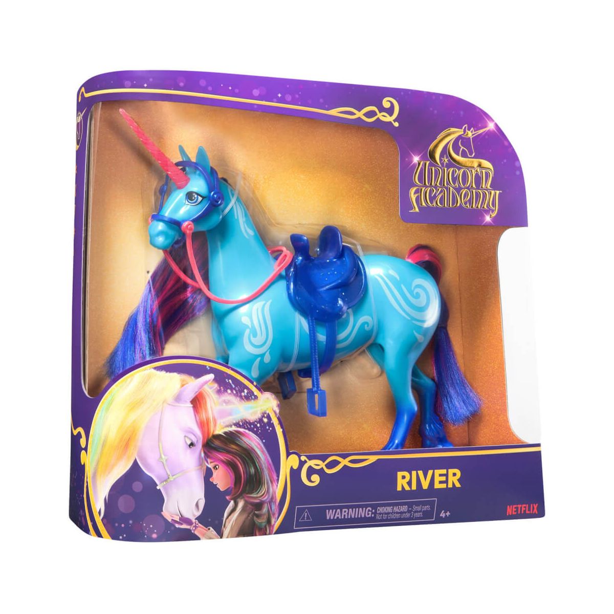 Schwer zu sagen, wer auf Unicorn Island und in der magischen Reitschule Unicorn Academy die Hauptrolle spielt. Sind es Sophia und ihre Mitschülerinnen und Mitschüler oder doch eher die Einhörner, die ihnen die Flirrfeen, je nach Persönlichkeit zuordnen? Isabel, die sportlichste und vielleicht ehrgeizigste Schülerin ist dennoch nicht begeistert, dass sie River bekommt, der schüchtern und schreckhaft ist und viel lieber chillt, als zu trainieren. Aber vielleicht ist es gerade das, was Isabel dazu bringen soll, etwas entspannter zu sein und ihre Mitschüler als Mitstreiter zu sehen und nicht als Konkurrenten. Das Blau von Rivers Fell- und Mähnenfarbe findet sich dann auch als Strähne in Isabels Haar wieder und auch ihre Reitkleidung nimmt die Farbe und das Wellenmuster auf, die für Rivers Wasser-Magie steht. Mit beweglichem Kopf sowie abnehmbarem Sattel und Zaumzeug lassen sich sowohl die Einhornpflege - eine wichtige Unterrichtseinheit auf dem Stundenplan - und die spannenden Abenteuer der Serie nachspielen. Isabel, Sophia und Ava sowie ihre Einhörner Leaf und Wildstar sind separat erhältlich, um das Leben an der Unicorn Academy lebendig werden zu lassen. Auch in kleinerem Maßstab von ca. 12 cm sind die Schülerinnen und Einhörner als Spielsets erhältlich, die zum Sammeln einladen..