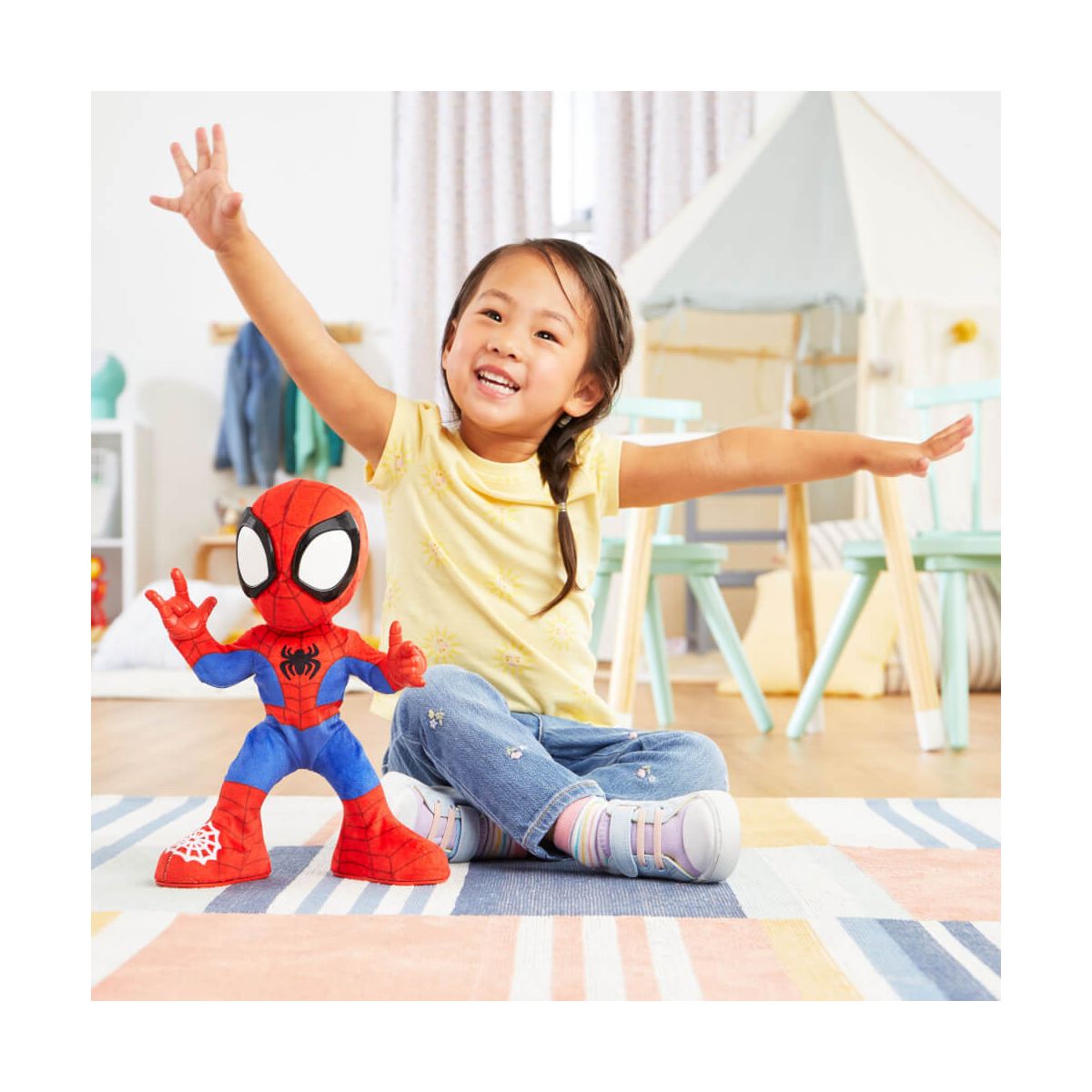 Mit dem Marvel Spidey and His Amazing Friends Tanz- Krabbelspaß Spidey zu Spidey und seine Super-Freunde gilt es, zu tanzen, krabbeln und webtastische Soundeffekte zu erleben. Jungen und Mädchen im Vorschulalter ab 3 Jahren können den Tanz-Modus aktivieren, indem sie auf das Netz an Spideys Fuß drücken. Drücken sie das Symbol auf Spideys Brust, ertönen 5 fantastische Soundeffekte sowie 2 Instrumentalstücke zum Mittanzen! Wer hat Lust auf spielerische Wandkrabbel-Action? Kinder können Spidey beim Krabbeln zusehen, wenn sie seinen Kopf nach oben neigen, seine Handgelenke drehen und ihn auf den Bauch legen. Puh, was für ein Abenteuer! Mit Spidey wird es bei einer Geschichte oder einem Nickerchen gemütlich. Der Plüsch Spidey ist mit einem weichen Stoff überzogen, der sich perfekt zum Kuscheln eignet, wenn die Spielzeit vorbei ist. Dieses Spielzeug zu Spidey und seine Super-Freunde ist ein tolles Marvel Geschenk für Jungen und Mädchen, das die Bewegung fördert, während sich die Kinder fantastische Abenteuer mit Spidey ausdenken. Copyright MARVEL. Alle Marken und eingetragenen Marken sind Eigentum der jeweiligen Inhaber. HASBRO sowie alle dazugehörigen Marken und Logos sind Marken von Hasbro, Inc..