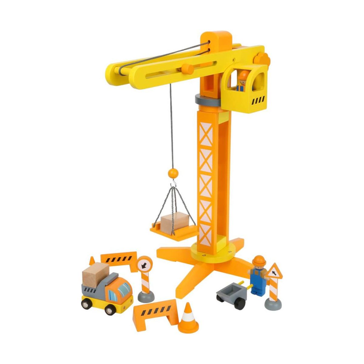 Robuster Baustellenkran aus Holz mit 360-Grad-Drehung und beweglichem Ausleger samt Haken für Transportgüter. Kleine Bauarbeiter können im Kinderzimmer die Baustelle mit Hütchen, Schildern und Absperrungen absichern. In der Gondel koordiniert der Kranfahrer die Transportfläche, die mit Hilfe der Kurbel und dem Seil sicher herabgelassen wird. Endlich Feierabend! Nach getaner Arbeit kann der fleißige Kranfahrer seinen Arbeitsplatz über die innenliegende Leiter verlassen. Das Kran-Set aus stabilem Holz bietet mit den umfangreichen Zubehörteilen großes Spielvergnügen und unterstützt kleine Kranfahrer beim Rollenspiel. Wer möchte auch Baustellenluft schnuppern? Höhe ca. 44cm. Ab 3 Jahren..