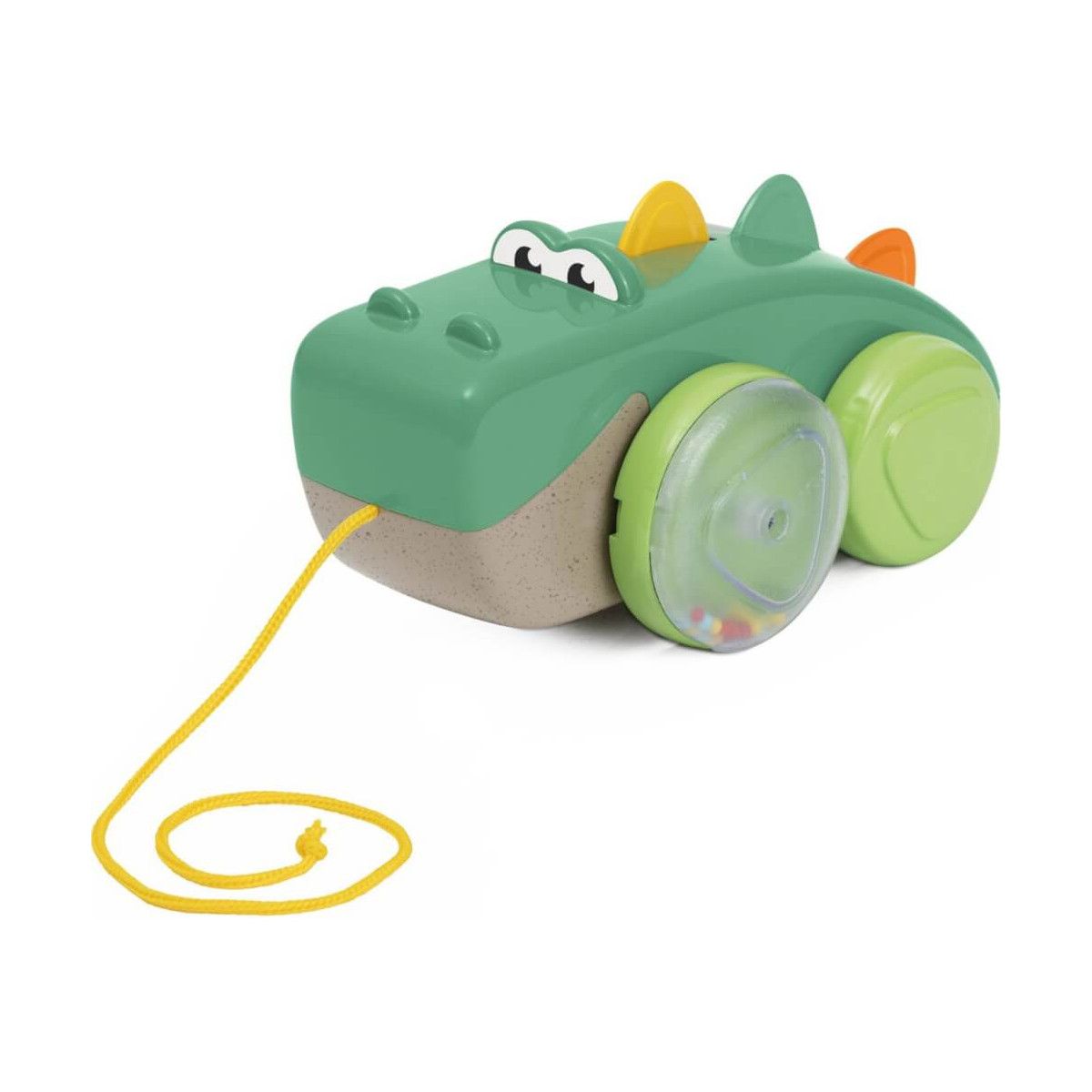 Ein niedliches Krokodil, der dazu dient zum Laufen zu animieren. Durch Ziehen an der Schnur bewegt sich Croco auf lustige Weise, wobei sich sein Körper und die Federkiele am Rücken auf und ab bewegen. • An der Schnur ziehen, um ein klingelndes Geräusch zu hören und die bunten Perlen in den Rädern zu sehen • Auf und ab bewegliche Federkiele • Rasselnde Perlen in den Vorderrädern • Die Schnur ist 50 cm lang, sodass das Baby laufen und Croco ziehen kann • Es entwickelt psychomotorische Fähigkeiten.