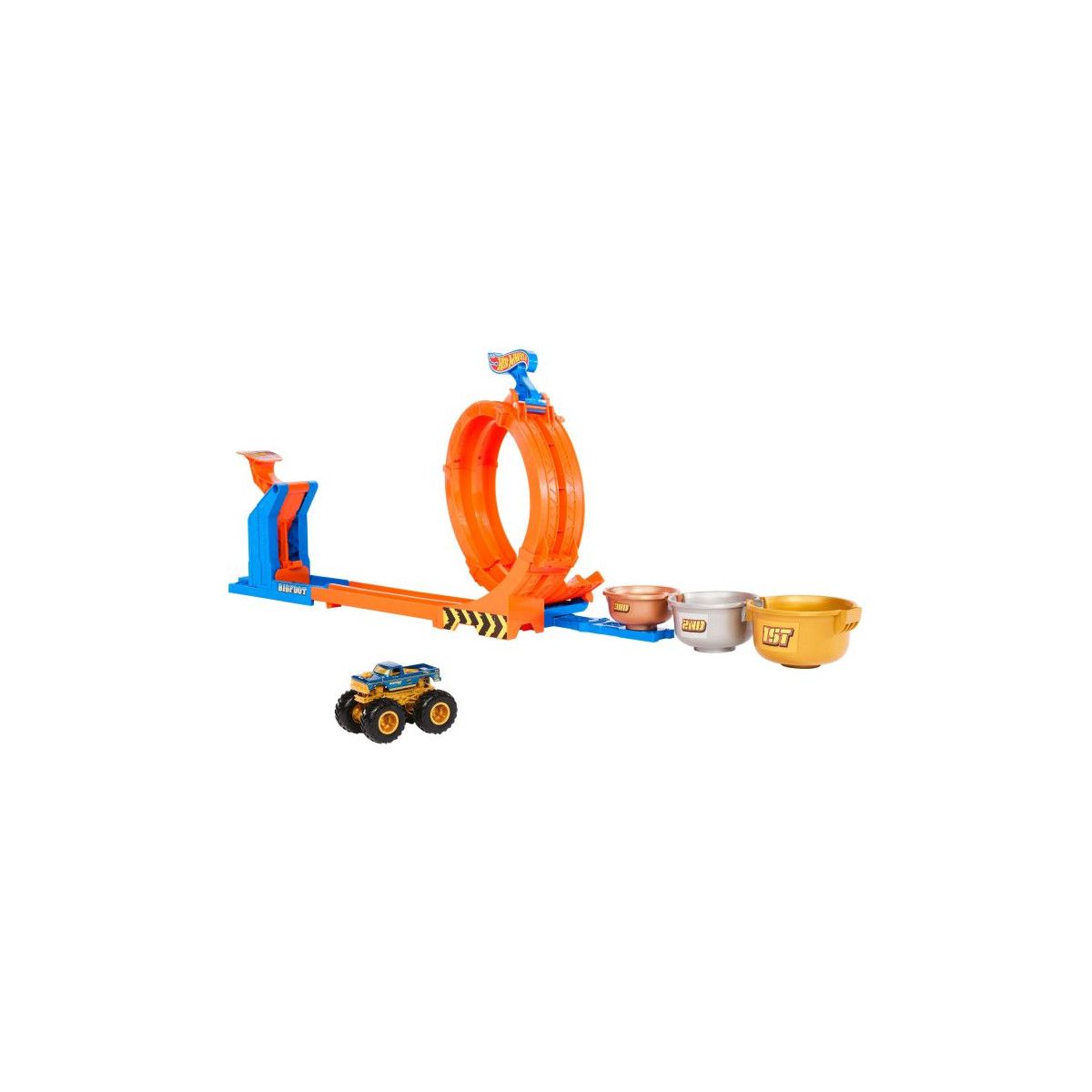 Dieses Hot Wheels Monster Trucks Loop Flip Trophy Challenge-Spielset feiert das 50. Jubiläum des Bigfoot. Es bietet zwei Spielmöglichkeiten: Kinder können den enthaltenen Bigfoot im Maßstab 1:64 durch einen Looping schleudern, bevor er in einem Pokal landet, oder den Looping umbauen, um mit einem Rückwärtssalto in einem Pokal zu landen. Die Pokale sind je nach Punktwert unterschiedlich groß, um die Herausforderung noch zu steigern und verschiedene Spielmöglichkeiten zu bieten. Das Ziel kann sein, als Erster in jedem Pokal zu landen oder die meisten Punkte zu sammeln. Der Die-Cast-Bigfoot mit exklusiver Deko feiert sein 50. Jubiläum. Abweichungen in Farbe und Gestaltung vorbehalten..