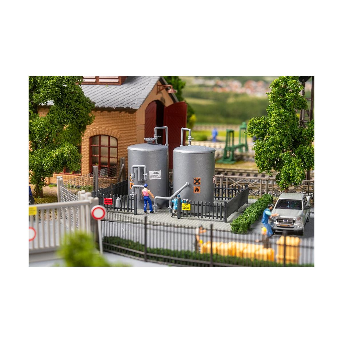 Zwei silberne Lagertanks bringen industriellen Charme auf Ihre Modellanlage. Umzäunt und mit mehreren Warnschildern versehen, fügen sie sich nahtlos in Werksgelände, Verladezonen oder Bahnhöfe ein. Ein schlichtes, aber wirkungsvolles Detail für realistische Szenen im industriellen Umfeld.