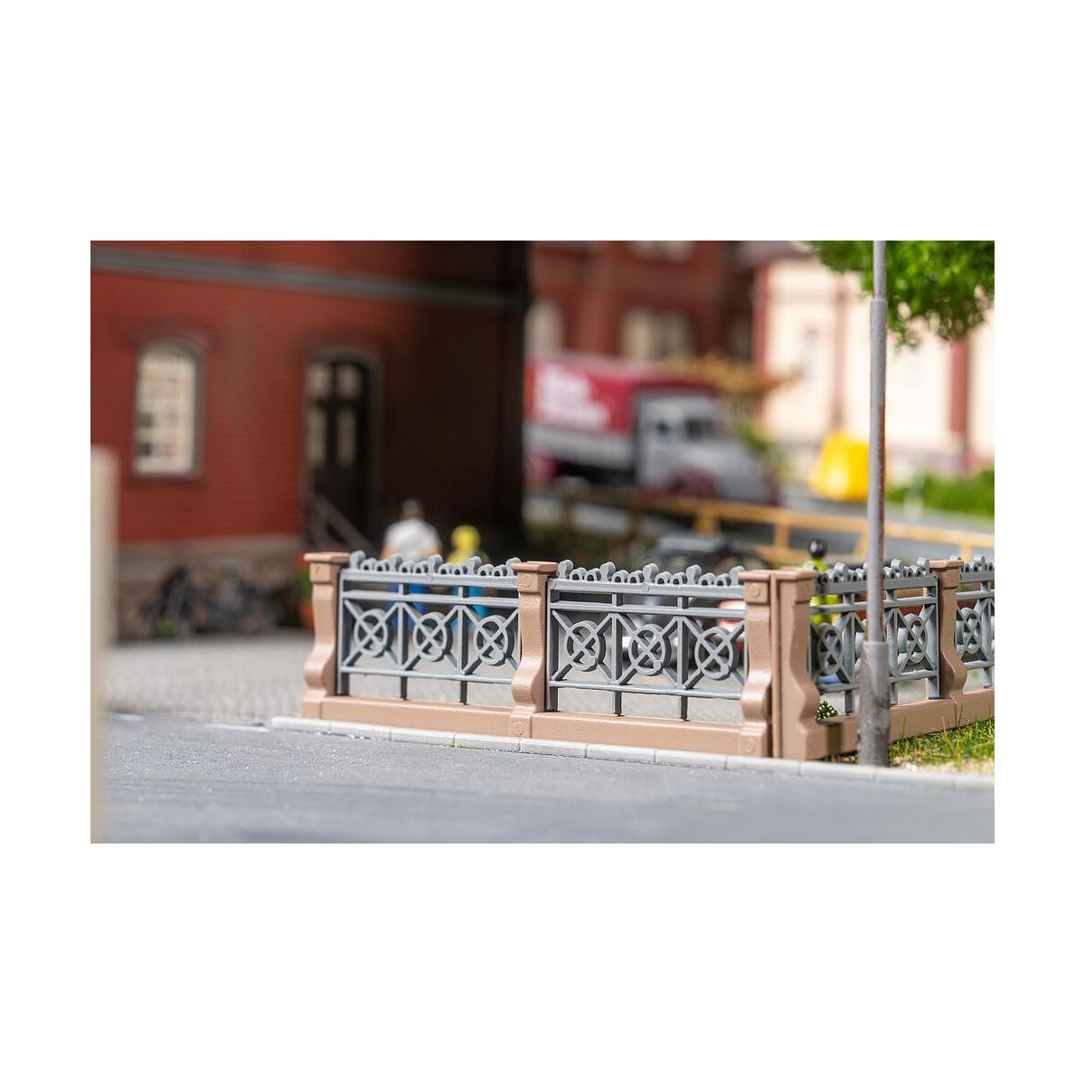 Vielseitigkeit in jeder Form: Dieser verzierte graue Villenzaun kommt in zahlreichen Variationen, die für viele Einsatzmöglichkeiten sorgen. Die Mauerstücke lassen sich perfekt als Unterteil des Zauns integrieren.