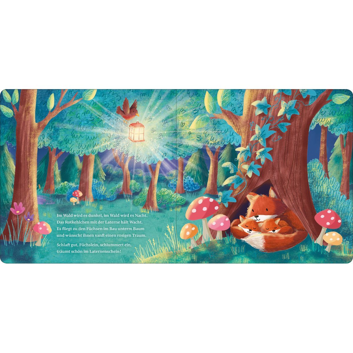 Schläfst du schon, kleines Entenküken? Begleite das Rotkehlchen auf seiner nächtlichen Reise durch den Wald. Mit seinem warmen Laternenlicht begleitet es liebevoll alle großen und kleinen Waldbewohner ins Land der Träume. Von den Füchsen über die Rehe am Waldrand bis hin zur Entenfamilie auf dem Teich - jedem schenkt das Rotkehlchen ein Gutenachtlicht, das Geborgenheit und Wärme spendet. Das Pappbilderbuch eignet sich perfekt für Kinder ab 6 Monaten und macht das Einschlafritual zu einem liebevollen Erlebnis für alle Sinne. Kuscheln, vorlesen, Licht an! Mit „Schlaf, Kindlein, schlaf'' wird das abendliche Einschlafritual zu einem liebevollen Erlebnis für Kinder und Eltern: Gemeinsam lest ihr die zauberhaften Verse und entdeckt die liebevollen Tierillustrationen, die zum Kuscheln einladen. Anschließend zieht ihr an der Papierschlaufe auf der Buchrückseite. So entsteht eine ganz besondere Nachttischlaterne. Der Anschaltknopf am Buchrand lässt warmes Licht erstrahlen, begleitet von einer sanften Gutenachtmelodie. Ein besonderes Buch, das zum liebevollen Gutenachtbegleiter wird, der Geborgenheit schenkt und kleine Träume wachsen lässt. • Liebevolle Einschlafbegleitung: Das Einschlafbuch mit integrierter Laterne unterstützt das abendliche Ritual mit sanftem Licht und beruhigender Melodie. • Einzigartiger Überraschungseffekt: Buch verwandelt sich in Nachttischlaterne • Alle Sinne werden angesprochen: Vorlesen, Kuscheln, Licht und Musik schaffen ein ganzheitliches Erlebnis. • Automatisches Abschalten von Ton und Licht: Die Gutenachtmelodie endet nach 38 Sekunden, das Licht schaltet sich nach 10 Minuten automatisch aus - für sicheren und entspannten Schlaf. • Schonende Lautstärke: Die Gutenachtmelodie von „Schlaf, Kindlein, schlaf'' wird in angenehmer Lautstärke speziell für empfindliche Kleinkindohren wiedergegeben • Praktischer Ein-/Ausschalter: Ton und Licht lassen sich dank des Knopfs am Buchrand jederzeit ein- und ausschalten. • Perfekt für kleine Kinderhände: Dicke Pappeseiten und handliches Format • Geprüfte Qualität: Das Buch unterliegt strengen Sicherheitsanforderungen und regelmäßigen Qualitätskontrollen nach europäischer Spielzeugsicherheitsrichtlinie.