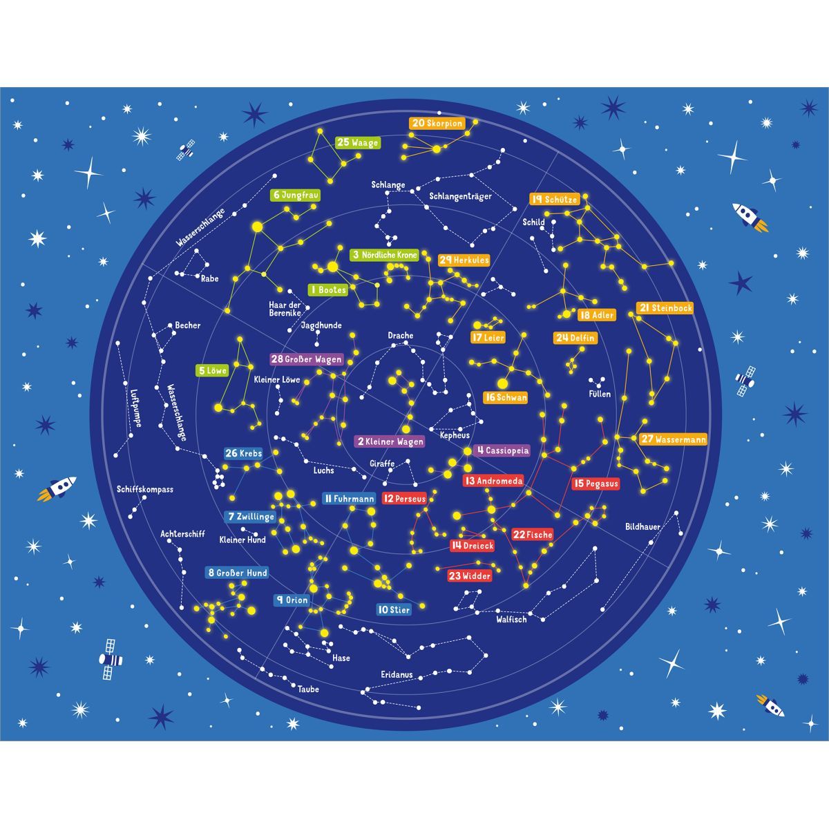 Sternbilder entdecken – mit nachtleuchtender Sternenkarte Tauche ein in die faszinierende Welt der Sternbilder! Diese Kartenbox enthält 30 wunderschön illustrierte Karten, die dir die wichtigsten Sternbilder und ihre spannenden Geschichten näherbringen. Als besonderes Highlight gibt es eine nachtleuchtende Sternenkarte, die dir hilft, den Nachthimmel selbst zu erkunden. Perfekt für Sterngucker und Himmelsforscher jeden Alters. Das erwartet dich: • 30 Karten mit Sternbildern: Jede Karte zeigt ein Sternbild, erklärt seine Form, Lage und die dazugehörige Mythologie • Nachtleuchtende Sternenkarte: Finde dich auch im Dunkeln am Himmel zurecht und entdecke die Sternbilder selbst • Wissensvermittlung: Erfahre spannende Fakten über Sterne, Entfernungen und kosmische Phänomene • Für jedes Alter: Ob Kind oder Erwachsener, diese Karten sind für jeden Sterngucker ein Erlebnis • Hochwertige Gestaltung: Robuste Karten mit ansprechendem Design, ideal zum Mitnehmen oder Verschenken Entdecke den Nachthimmel Diese Kartenbox ist ein Must-have für alle, die den Sternenhimmel besser kennenlernen wollen. Perfekt für abendliche Erkundungstouren, als Geschenk für Freunde oder für gemütliche Nächte unter freiem Himmel. Mach dich bereit, die Sterne zu erkunden!