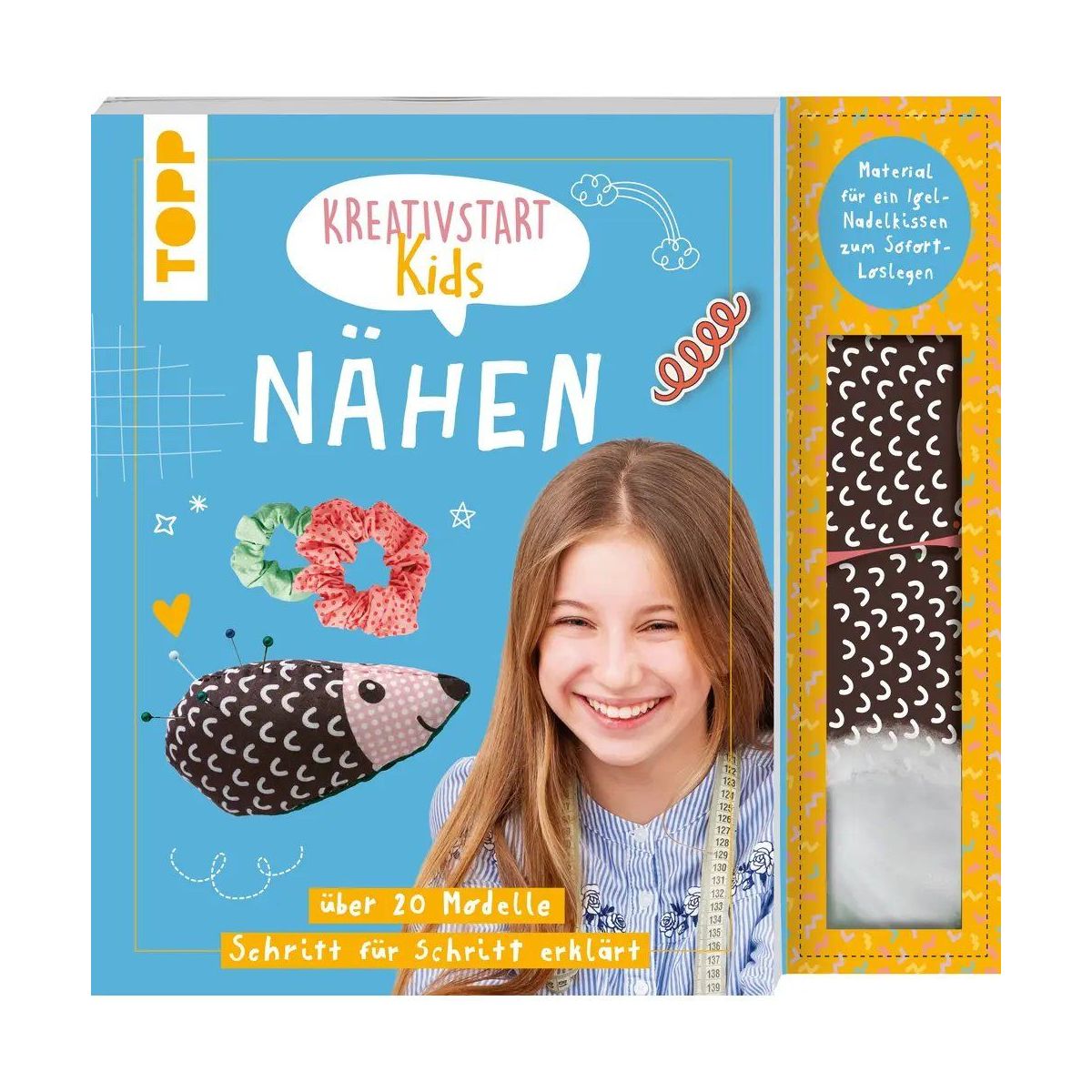 GRUNDKURS EINFACHE ANLEITUNGEN – über 20 altersgerechte Nähideen KOMPLETT-SET – Box mit Stoff und Füllwatte für ein niedliches Igel-Nadelkissen PRAKTISCHE PRODUKTFORM – Materialbox und Buch sind voneinander trennbar