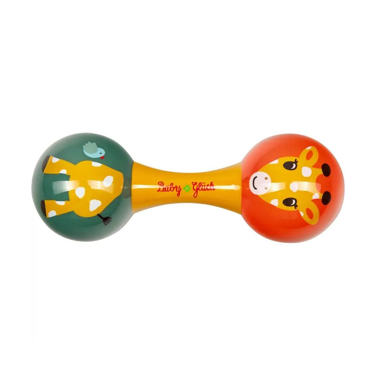 Die Maracas Giraffe - Babyglück von Die Spiegelburg bestehen aus zwei gefüllten Kugeln, die mit einem Griff verbunden sind und für Rhythmus und Spielfreude sorgen. Bei jeder Bewegung erzeugen die beiden Kugeln ein sanftes Rasseln, das Babys begeistert und spielerisch ihr Taktgefühl fördert. Das fröhliche Giraffenmotiv mit bunten Farben macht die Rassel zusätzlich zu einem süßen Blickfang. Mit ihrer Größe von ca. 14 x 5 cm liegt sie ideal in kleinen Kinderhänden und lädt zum fröhlichen Schütteln und Entdecken von Geräuschen ein.