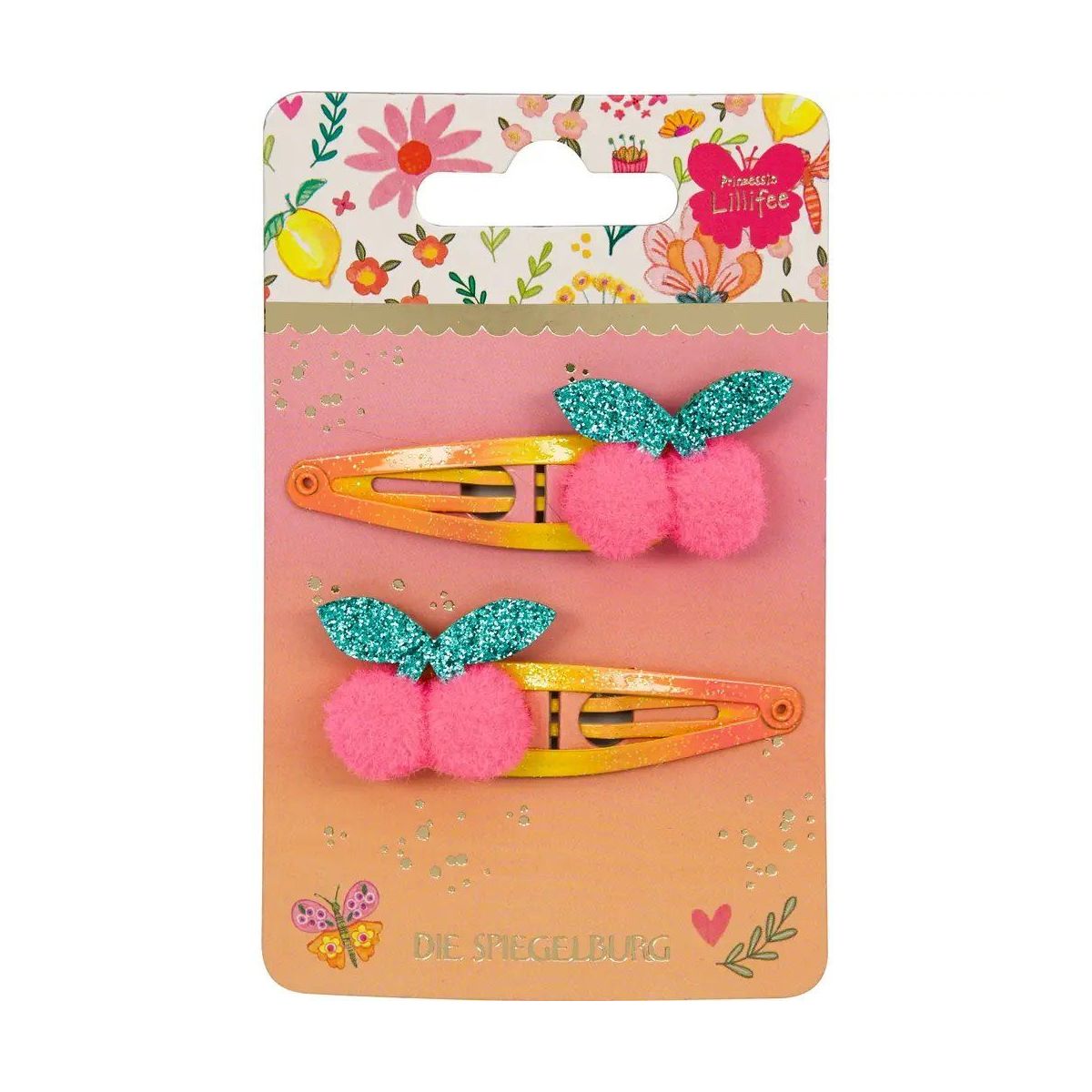 Die Haarclips Kirschen - Prinzessin Lillifee von Die Spiegelburg verleihen allen Kinderfrisuren einen verspielten Akzent. Die beiden Clips sind mit glitzernden Blättern und flauschigen Pompoms als Kirschen gestaltet – ein süßes Detail für festliche Anlässe oder den Alltag.