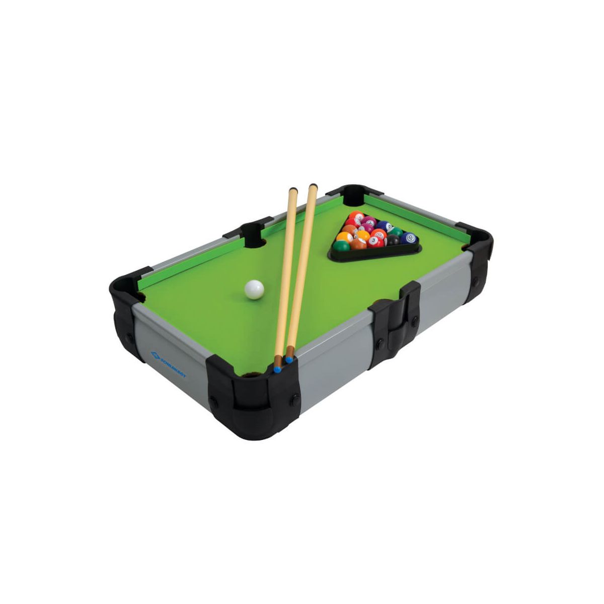Großer Spielspaß im kleinen Format - der neue Mini-Billiard-Tisch von Schildkröt bietet perfekten Spielspaß bei jeder Gelegenheit, ist vielseitig einsetzbar und durch seine kompakte Größe (50 x 30 x 9cm) und das geringe Gewicht (nur 1,3kg) einfach zu transportieren und zu verstauen. Das Set beinhaltet neben dem Mini-Tisch 2 Queues (50cm), 16 Billardkugeln ( 2,6cm) und ein Triangel zur Anordnung der Kugeln. Die versenkten Kugeln werden in den 6 Kunststofftaschen aufgefangen und können über einen praktischen Schiebemechanismus wieder entnommen werden. Der Mini Billiard Tisch ist aus robustem Kunststoff konstruiert, steht idealerweise auf einem keinen Tisch (Stehtisch) und ist mit Anti-Rutsch Füßen ausgestattet. Geeignet für das spielerische Training der Hand-Auge-Koordination bei Kindern. ACHTUNG! Nicht geeignet für Kinder unter 3 Jahren. Artikel enthält Kleinteile, Verschluckungs- und Erstickungsgefahr. Altersempfehlung: 5+. Über Schildkröt: Die über 100 Jahre alte deutsche Marke Schildkröt gilt als Erfinder des Tischtennisballs. Heute bietet Schildkröt neben Tischtennis auch eine sehr umfangreiche Funsport-, Rollsport- und Fitness-Kollektion an und gilt in gewissen Bereichen als Marktführer. Die Produktentwicklung erfolgt ausnahmslos in Deutschland. Die weltweiten Produktionsstätten werden streng überwacht und genügen höchsten Sozialstandards..