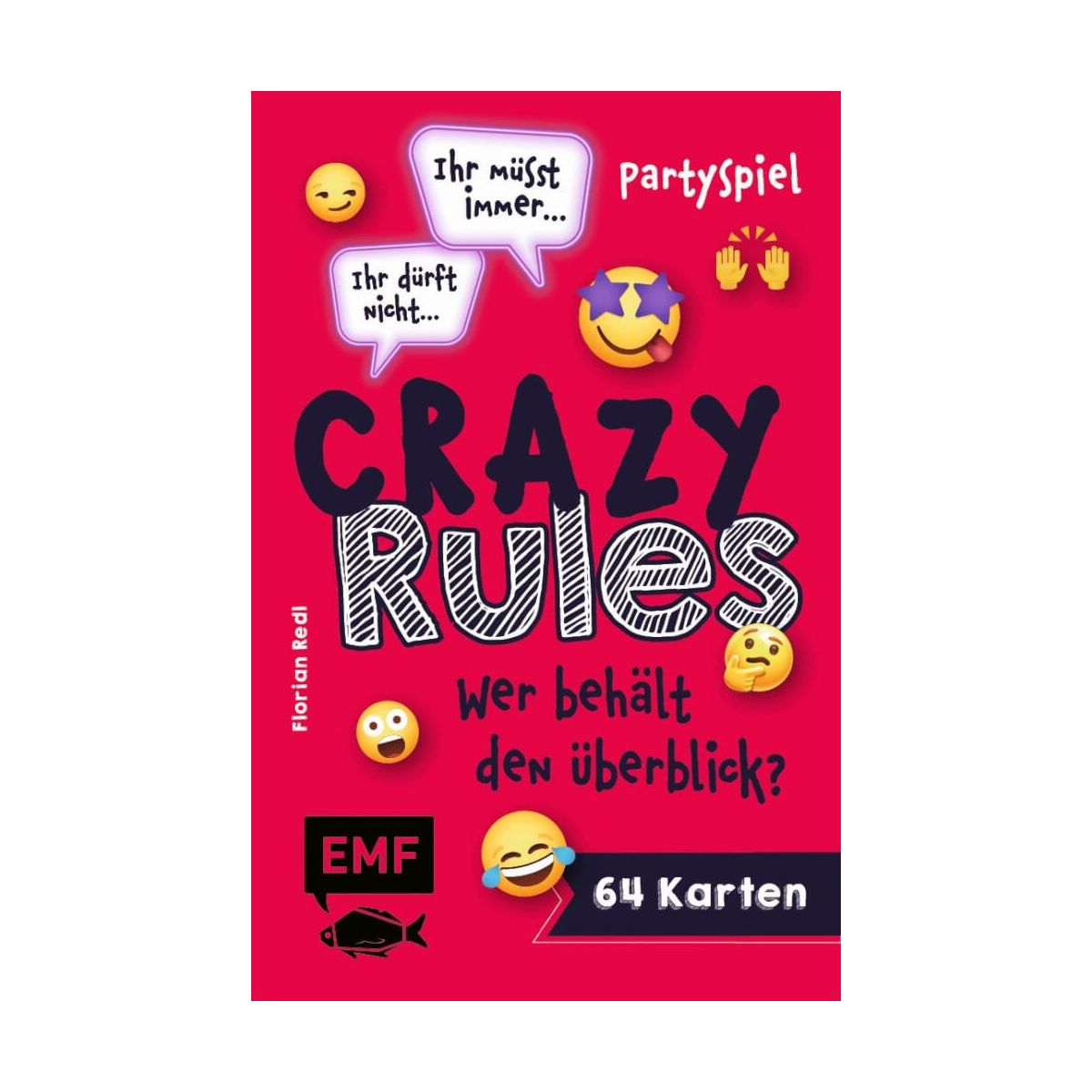 Crazy Rules – das Partyspiel für jede Menge Spaß Ob unterwegs, zu Hause oder als spannendes Partyspiel – mit diesem Kartenspiel wird es garantiert nicht langweilig. Witzig, frech und manchmal auch ein bisschen gemein, sorgen über 60 verrückte Regeln, Verbote und Aufgaben garantiert für Spaß und Abwechslung auf Geburtstagspartys und Klassenfahrten. Das perfekte Spiel zum Lachen und Spaß haben. • Über 60 Karten mit abwechslungsreichen Regeln, Verboten und Fragen • Der Spieleklassiker – jetzt auch für Kids und Teens • Praktisches Mitnahmeformat – perfekt für zu Hause und unterwegs Regeln wie Wer eine Karte zieht, muss den Kopf schief halten oder Verbote wie Ihr dürft den Tisch nicht berühren müssen eingehalten werden und sorgen für jede Menge Lacher am Tisch – vor allem weil es immer mehr Regeln werden. Wer behält da den Überblick? Perfekt für zu Hause, unterwegs oder als Geschenk.