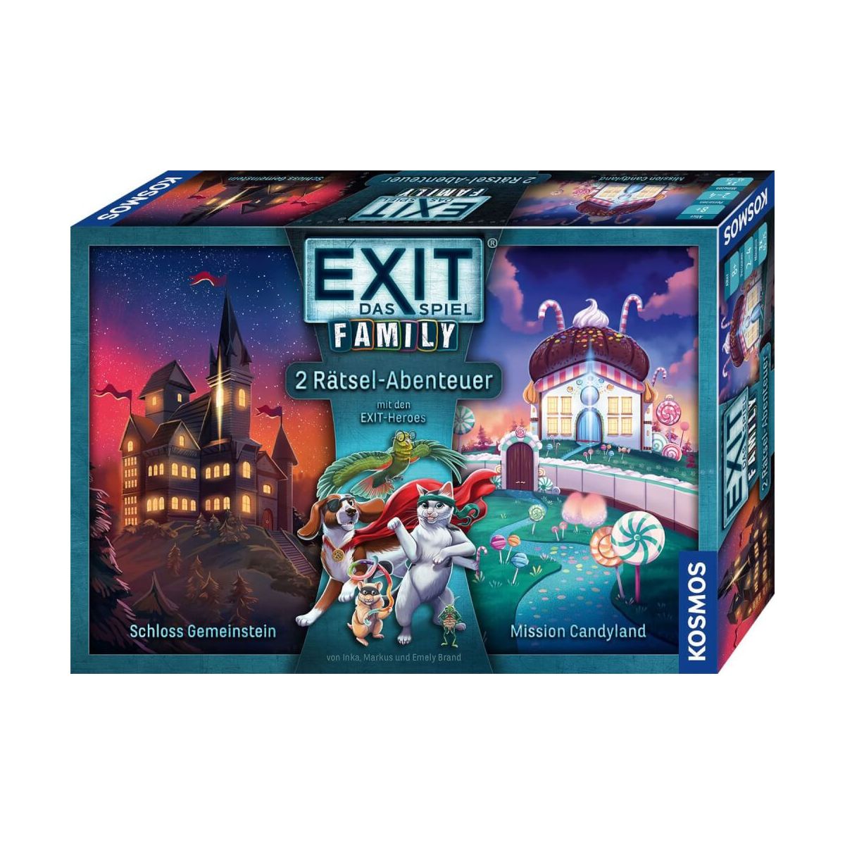 Ein cooles Team aus tierischen Superhelden gründet einen geheimen Club! Gleich zwei spannende Rätselabenteuer erwarten sie. Die Freunde erleben seltsame Dinge auf Schloss Gemeinstein, als sie dort einem mysteriösen Verschwinden auf den Grund gehen. Und auch in der Süßigkeitenfabrik Candyland geht es nicht mit rechten Dingen zu. Warum bekommt Hamster Häm Bauchschmerzen vom heimlichen Naschen? Familien mit Kindern ab acht Jahren helfen den fünf Helden bei diesen aufregenden Rätseln. EXIT® – Das Spiel Family ist der leichter Einstieg in die Escape Game-Welt für die ganze Familie..