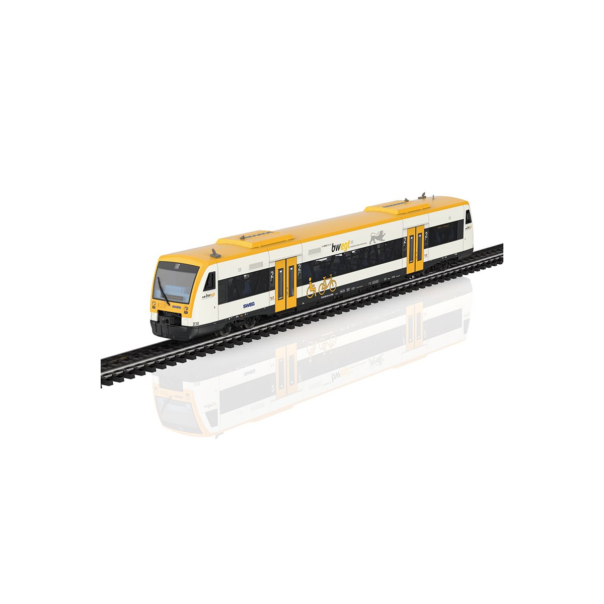 Vorbild: Dieseltriebwagen vom Typ Regio Shuttle RS1 als Baureihe 650 der Südwestdeutschen Landesverkehrs-GmbH (SWEG). Ausführung mit Scharfenbergkupplung und tief liegender Zugzielanzeige. Gestaltung im Landesdesign Baden-Württemberg (bwegt). Betriebsnummer 238 (NVR-Nummer: 95 80 0 650 634-8 D-SWEG). Betriebszustand ab 2024.