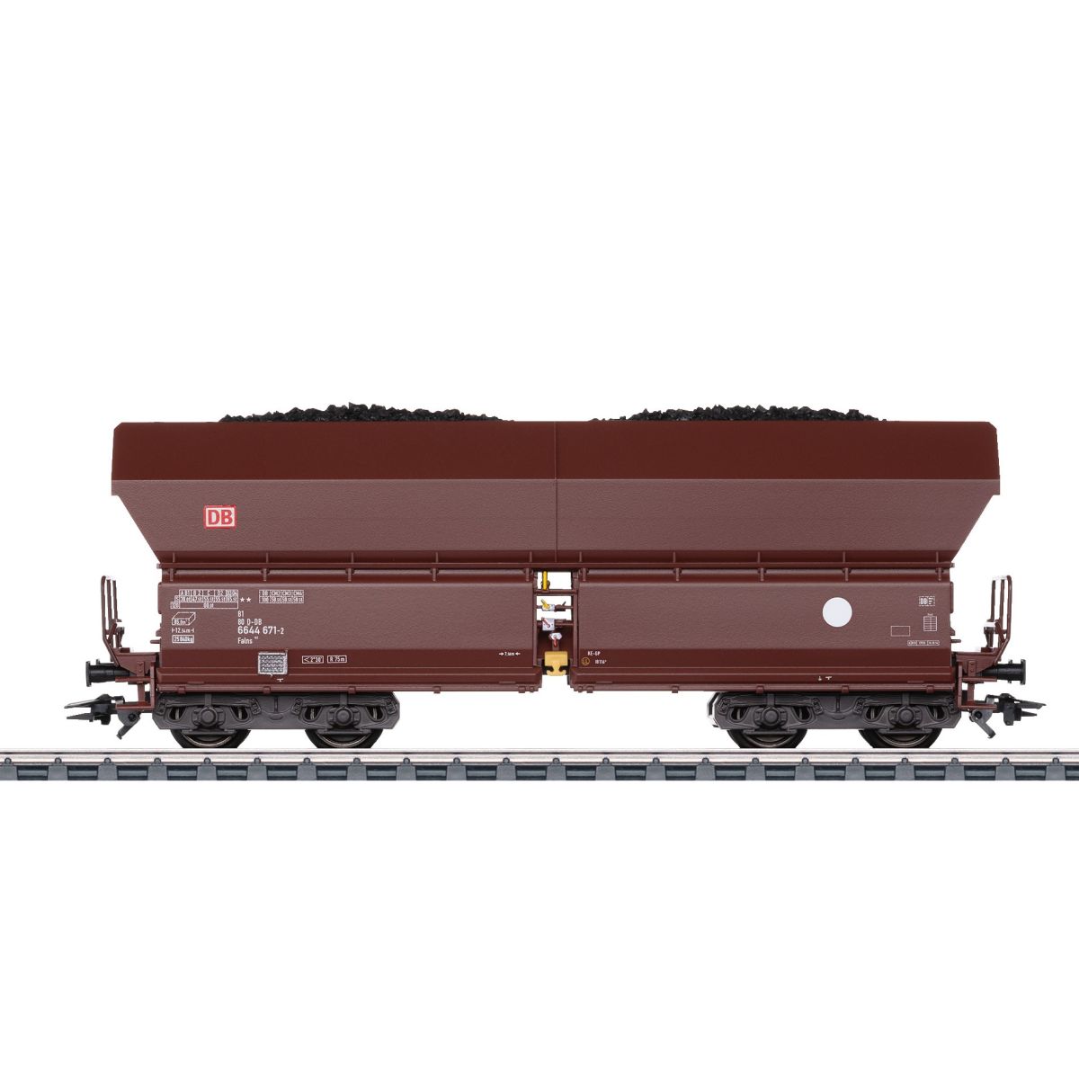 Vorbild: vierachsiger, großräumiger, offener Selbstentladewagen Bauart Falns 182 der Deutschen Bahn AG (DB AG). Eingesetzt zum Transport von nässeunempfindlichen Schüttgütern. Rotbraune Grundfarbgebung. Wagen mit 2 Übergangsbühnen. Ohne Handbremse. Drehgestelle der Bauart 665. Betriebszustand um 2015.