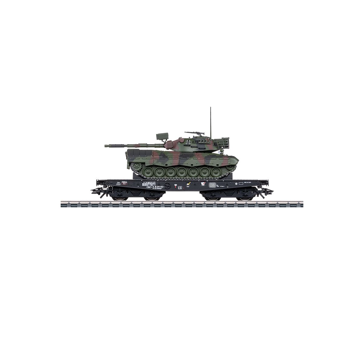 Vorbild: Schwerlast-Flachwagen Bauart Rlmmps 650 der Deutschen Bundesbahn (DB), beladen mit einem Kampfpanzer Leopard 1A1 der Deutschen Bundeswehr.