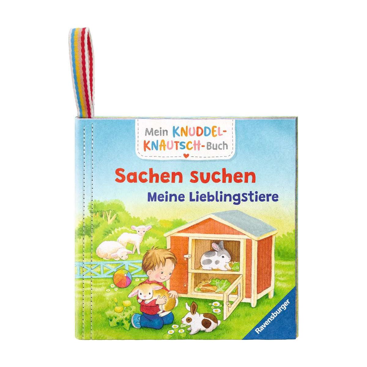 Stoffbuch zum Kuscheln, Knabbern und BadenKatzen, Hunde, Kaninchen und andere süße Tiere. Liebevolle Illustrationen bieten viele Möglichkeiten zum Suchen und Benennen. Die beliebte Sachen-suchen-Reihe nun als Knuddel-Knautsch-Buch: Dieses federleichte Stoffbuch für Kinder ab 6 Monaten kommt mit ins Bett, in den Sandkasten, in die Badewanne und auch mal in die Waschmaschine. Unser buntes Knuddel-Knautsch-Buch lädt dazu ein, Bücher mit allen Sinnen zu entdecken ? egal, ob mit Händen oder Zähnen. Mein Knuddel-Knautsch-Buch ist ein superstarkes Stoffbuch für jede Gelegenheit! Es ist besonders robust und lässt sich weder zerreißen noch zerbeißen. Trotzdem ist es kuschelweich und federleicht, sodass es auch für Kinder ab 6 Monaten bereits gut greifbar ist. Die bunten Bücher laden dazu ein, erste Geschichten mit allen Sinnen zu entdecken. Waschbar bei 60°C wird dieses Buch zu einem langlebigen Begleiter für kleine Leseratten.Mit der praktischen Schlaufe wird es schnell am Hochstuhl, Laufstall oder Kinderwagen befestigt..