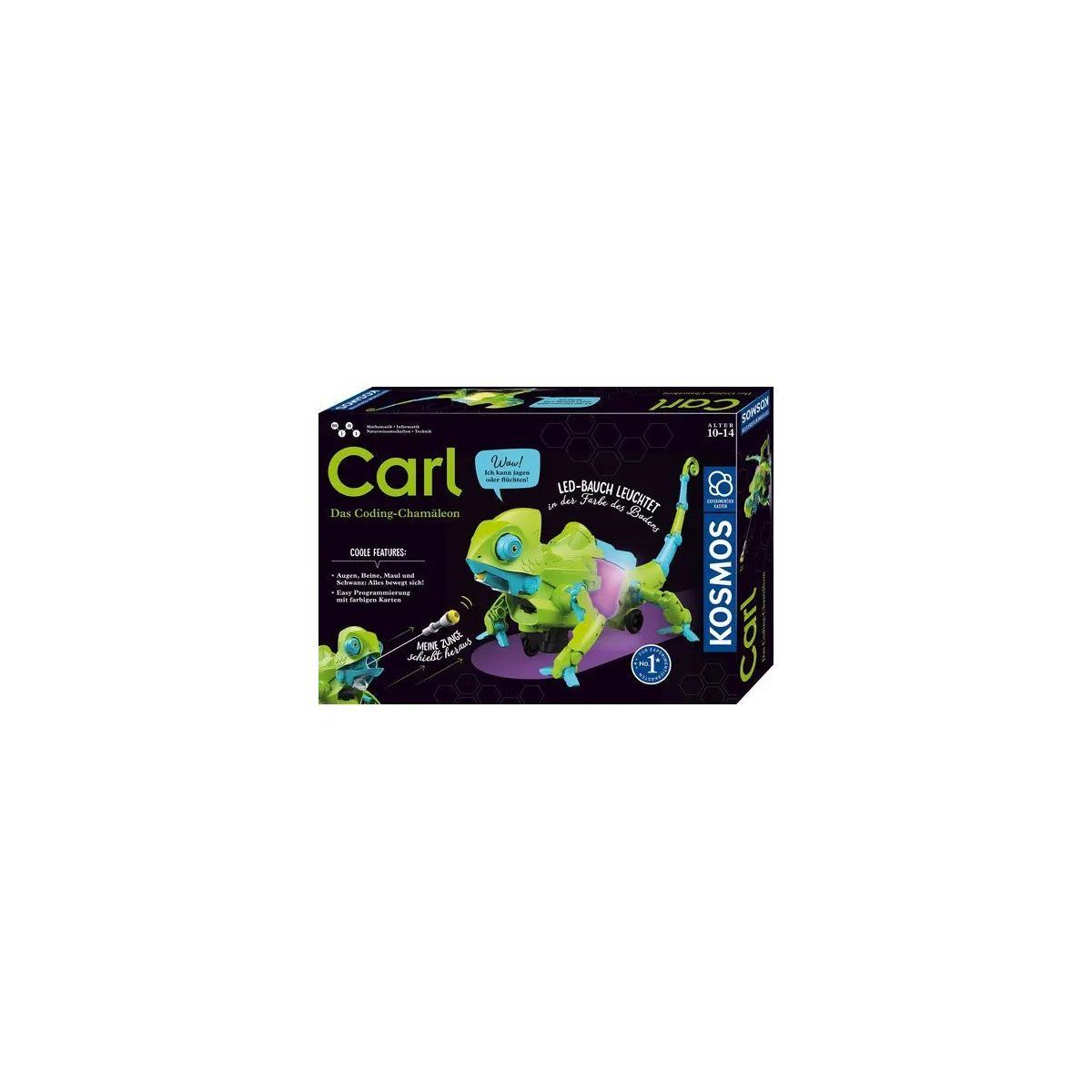 Aufgepasst, jetzt kommt Carl! Bewegliche Beine und Augen, ein einstellbarer Schwanz, eine herausschnellende Zunge sowie der leuchtende, farbwechselnde Körper lassen diesen Roboter fast wie ein echtes Chamäleon aussehen und sorgen für stundenlangen Spiel- und Programmierspaß. Denn durch die geniale Möglichkeit, Carl den Chamäleon-Roboter selbst zu programmieren, können Kinder auch ohne Vorkenntnisse Carls Verhalten und seine Bewegungen vollständig selbst steuern! Ausgestattet mit verschiedenen Sensoren, „liest das Chamäleon die beigelegten Farbkarten und führt die programmierten Aktionen aus..