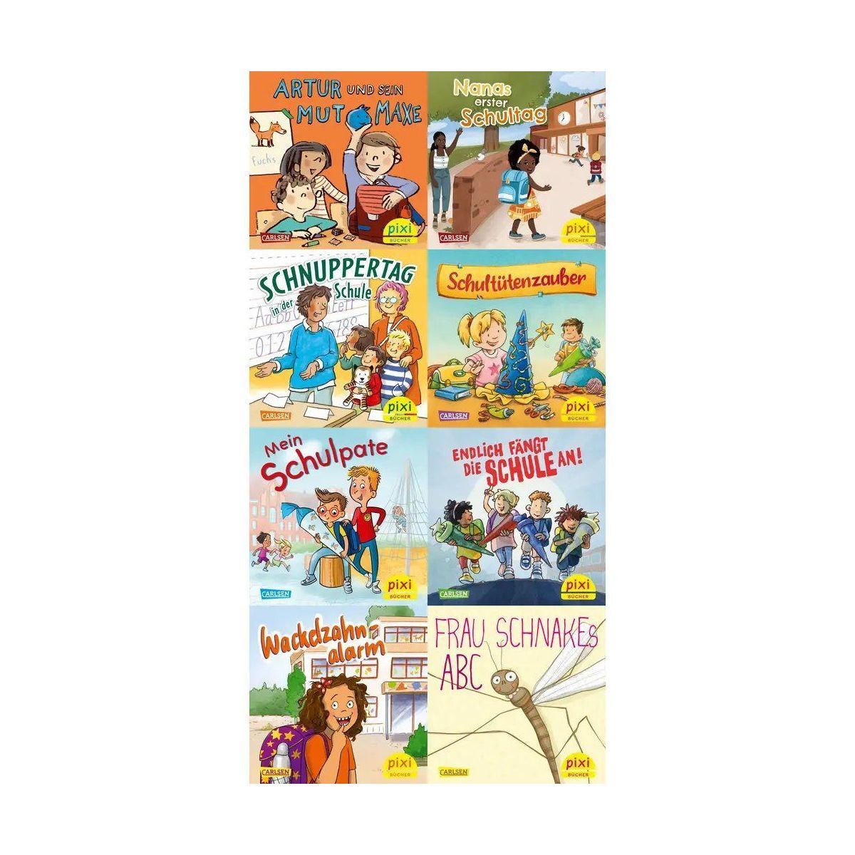 Pixi-Geschichten zum Schulstart – spielerisch vorbereitet auf die Schule! Mit diesen acht Pixi-Geschichten werden Vorschulkinder liebevoll auf die spannende Zeit des Schulanfangs eingestimmt. Und Grundschulkinder bei ihren ersten Erlebnissen in der Schule begleitet. Wie läuft der erste Schultag ab? Wer hilft mir, mich zurechtzufinden? Und wie finde ich neue Freunde? Ob Schnuppertag, Schultüten, Wackelzähne oder das Schließen von Freundschaften – hier wird der Start in die Schule greifbar und fröhlich erzählt. Ideal für den Schulanfang – mit Pixi spielend den neuen Alltag entdecken! In der Pixi-Serie „In die Schule mit Pixi sind folgende Bücher enthalten: • Artur und sein MutMaxe • Nanas erster Schultag • Schnuppertag in der Schule • Schultütenzauber • Mein Schulpate • Endlich fängt die Schule an • Wackelzahnalarm • Frau Schnakes ABC.