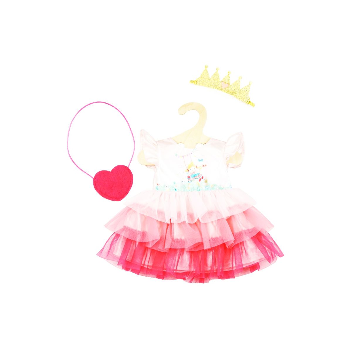 Das wunderschöne Puppenkleid „Prinzessin Emiliy verwandelt Deine Puppe in eine bezaubernde Schönheit. Das zartrosa schimmernde Oberteil ist mit der niedlichen Prinzessin Emily bedruckt, die in ihrer Zauberwelt luftig-leicht auf ihrer Schaukel schwingt. Die kräftigen Pinktöne der verspielten Tüll-Volants ergeben einen prachtvoll leuchtenden Kontrast. Die goldene Glitzerkrone und pinke Herz-Tasche machen das fantasievolle Puppenoutfit perfekt. Ein atemberaubendes Puppenoutfit, das Deiner Puppe jede Menge Glamour verleiht. Für Kinderhände gemacht: Der Klettverschluss im Rücken sorgt dafür, dass das Puppenkleid kinderleicht an- und ausgezogen werden kann. Die hochwertige Verarbeitung sichert langanhaltenden Spielspaß. Das Puppenkleid passt den meisten marktgängigen Puppen der Größe 28-35 cm. Es ist auch in einer weiteren Ausführung für Puppengröße 35-45 cm (Art.-Nr. 2580) erhältlich. Der Artikel wird auf einem Holzkleiderbügel geliefert..