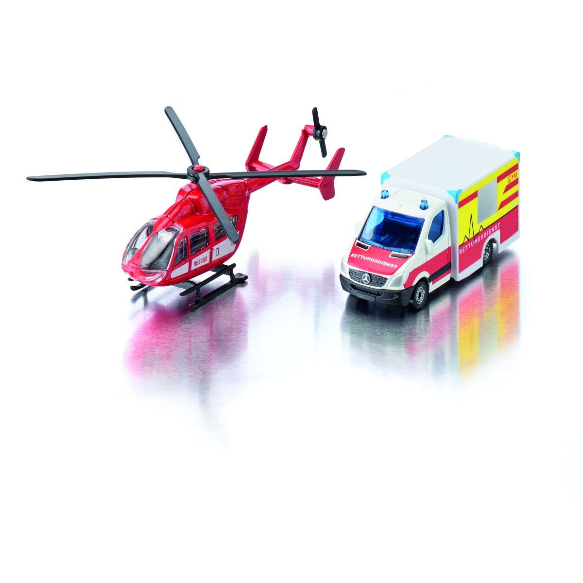 Dieses hochwertige Spielset bringt Spannung und Abenteuer ins Kinderzimmer! Mit dem detailgetreu gefertigten Mercedes-Benz Rettungswagen und dem Eurocopter EC 145 Helikopter können kleine Helden aufregende Rettungseinsätze nachspielen. Beide Modelle sind überwiegend aus Metall gefertigt und überzeugen durch ihre robuste Bauweise. Im kindgerechten Maßstab gestaltet, ist das Set perfekt für kleine Hände geeignet. Der drehbare Rotor des Helikopters sorgt für noch mehr Spielspaß und lädt zu fantasievollen Einsätzen ein. Ein Muss für alle jungen Fans von Rettungsfahrzeugen – hier werden Kinderträume wahr!.