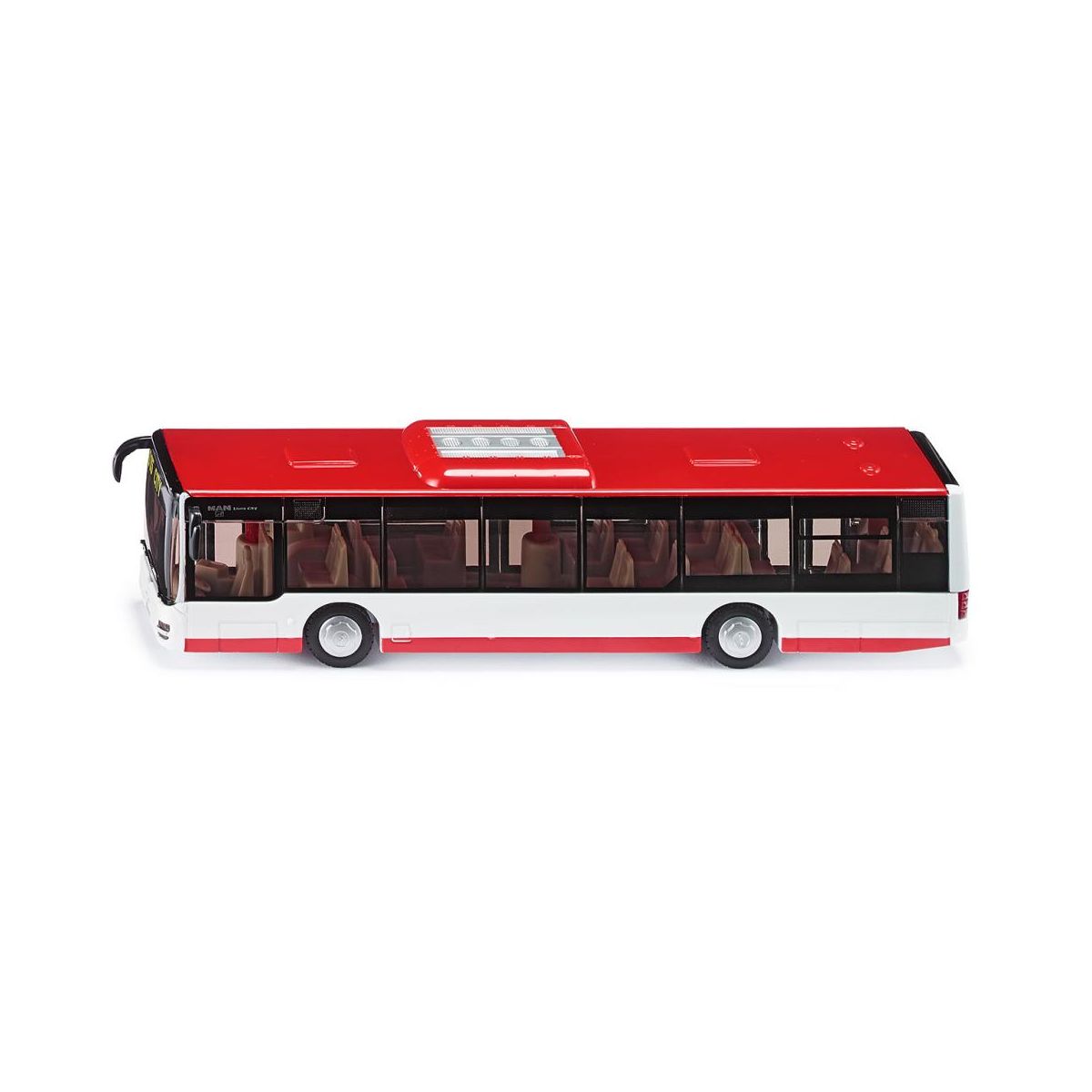 Das sehr aufwändige Busmodell des Originalvorbilds MAN Lion‘s City im Maßstab 1:50 präsentiert sich jetzt in einem markanten gelben Design. Die Details überzeugen durch Räder mit gummierten Laufflächen, Zwillingsbereifung sowie zwei Türen an der rechten Fahrzeug-seite, die sich öffnen lassen. Gleiches gilt für die Motorklappe im Heck. Die getönten Scheiben, separaten Rückspiegel und der eingesetzte Kühlergrill verleihen dem Modell eine authentische Optik. Die Leuchten vorne und hinten aus Kunststoff sowie der Dachaufbau mit Klimaanlage runden das hochwertige Erscheinungsbild ab..