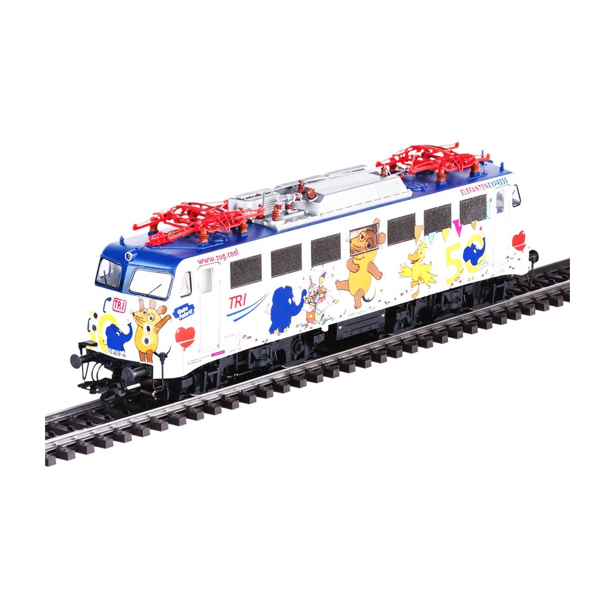 Vorbild: Elektrolokomotive Baureihe 110 der Train Rental GmbH (TRI). Lokkasten mit aerodynamischer Front, der sogenannten Bügelfalte, mit rechteckigen Klatte-Lüftergittern und Maschinenraumfenstern. Betriebsnummer 110 469-4. Betriebszustand ab Januar 2025 in auffälliger Gestaltung als Elefantenexpress.