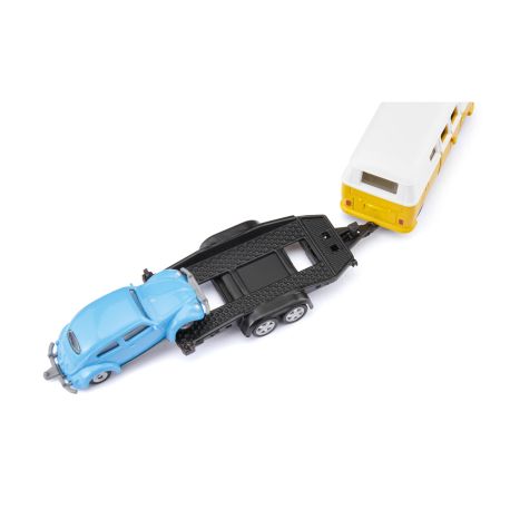 Zwei Kult-Klassiker für kleine Entdecker - Dieses liebevoll gestaltete Spielset bringt gleich zwei Legenden der Automobilgeschichte ins Kinderzimmer: Den kultigen VW T1 „Bulli und den weltberühmten VW Käfer. Der VW T1 strahlt in einer fröhlichen gelb-weißen Farbgebung und zieht auf seinem Anhänger den hellblauen Käfer – ein unschlagbares Duo, das Kinderherzen höherschlagen lässt. Der VW T1 begeistert mit seinem charmanten Design und der robusten Verarbeitung, perfekt geeignet für aufregende Spielabenteuer. Mit seinem Anhänger lässt sich der Käfer bequem transportieren – ob auf die Fantasiereise ans Meer oder zum nächsten Abenteuer im Kinderzimmer. Der Anhänger kann kinderleicht an- und abgekuppelt werden, wodurch sich zahlreiche Spielmöglichkeiten eröffnen. Der hellblaue VW Käfer, ebenfalls eine detailreiche Nachbildung, ergänzt den Spielspaß perfekt. Dank seiner kompakten Form und stabilen Bauweise ist er ideal für kleine Kinderhände. Gemeinsam sorgen der T1 und der Käfer für unzählige Stunden kreativen Spielens, bei dem Kinder ihre Fantasie und Feinmotorik entwickeln können. Dieses Set ist aus hochwertigen Materialien gefertigt und bietet eine sichere und langlebige Spielfreude. Ob alleine oder zusammen mit anderen Fahrzeugen – dieses Set ist der perfekte Einstieg in spannende Abenteuerwelten auf vier Rädern!.