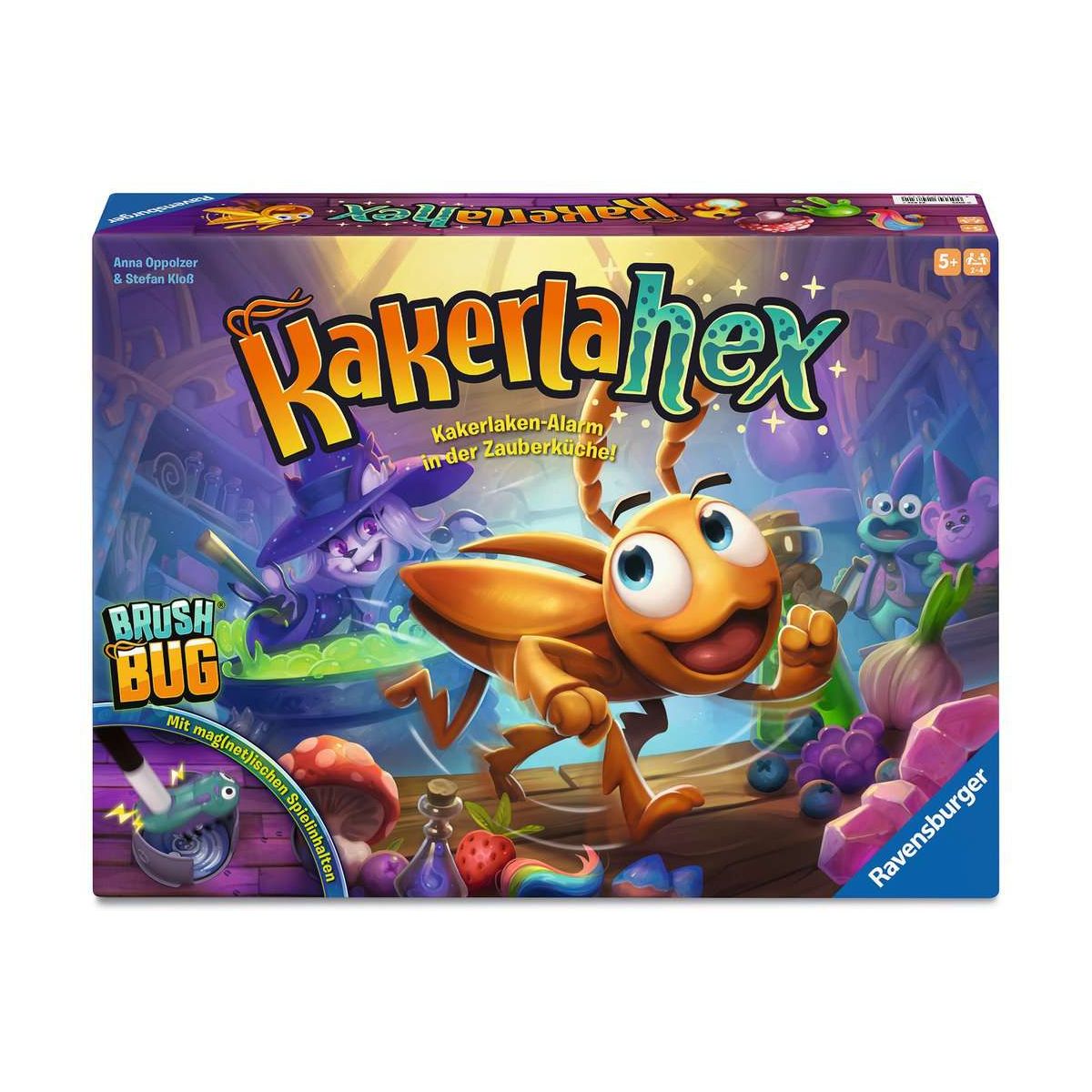 Eines Nachts im Zauberwald, die Hexen brauen ihre Tränke. Aber was war das? Plötzlich wuselt eine Kakerlake zwischen den Zauberkesseln herum! Fällt sie in einen Trank, ist dieser verdorben. Schwingt den Zauberstab und findet die richtigen magischen Zutaten! Gewonnen hat, wer die meisten Punkte für erfolgreich gebraute Tränke sammeln konnte.Das Wasser kocht schon in den Zauberkesseln. Jetzt fehlen nur noch die richtigen magischen Zutaten! Wo war nochmal der mächtige Kristall? Und wo habt ihr das Spinnennetz hingelegt?! Was für ein Chaos, jetzt wuselt auch noch eine Kakerlake zwischen den Zauberkesseln herum! Findet die richtigen magischen Zutaten. Wer kann sich am besten merken, in welchen Kessel welche magische Zutat gehört? Behaltet außerdem die Kakerlake im Auge! Fällt sie in einen Kessel, wird euer magischer Trank verdorben. Schnell, holt die Kakerlake mit dem magischen Zauberstab aus dem Kessel raus und deckt einen Kakerlaken-Chip auf. Wurde euer Trank zu verdorbener Brühe? Dann bekommt ihr leider keinen Punkt für diesen Trank. Oder hattet ihr Glück und die Kakerlake hat den Trank in den seltenen goldenen Kakerlakentrank verwandelt? Wer für fertig gebraute Tränke die meisten Punkte sammelt, gewinnt!.