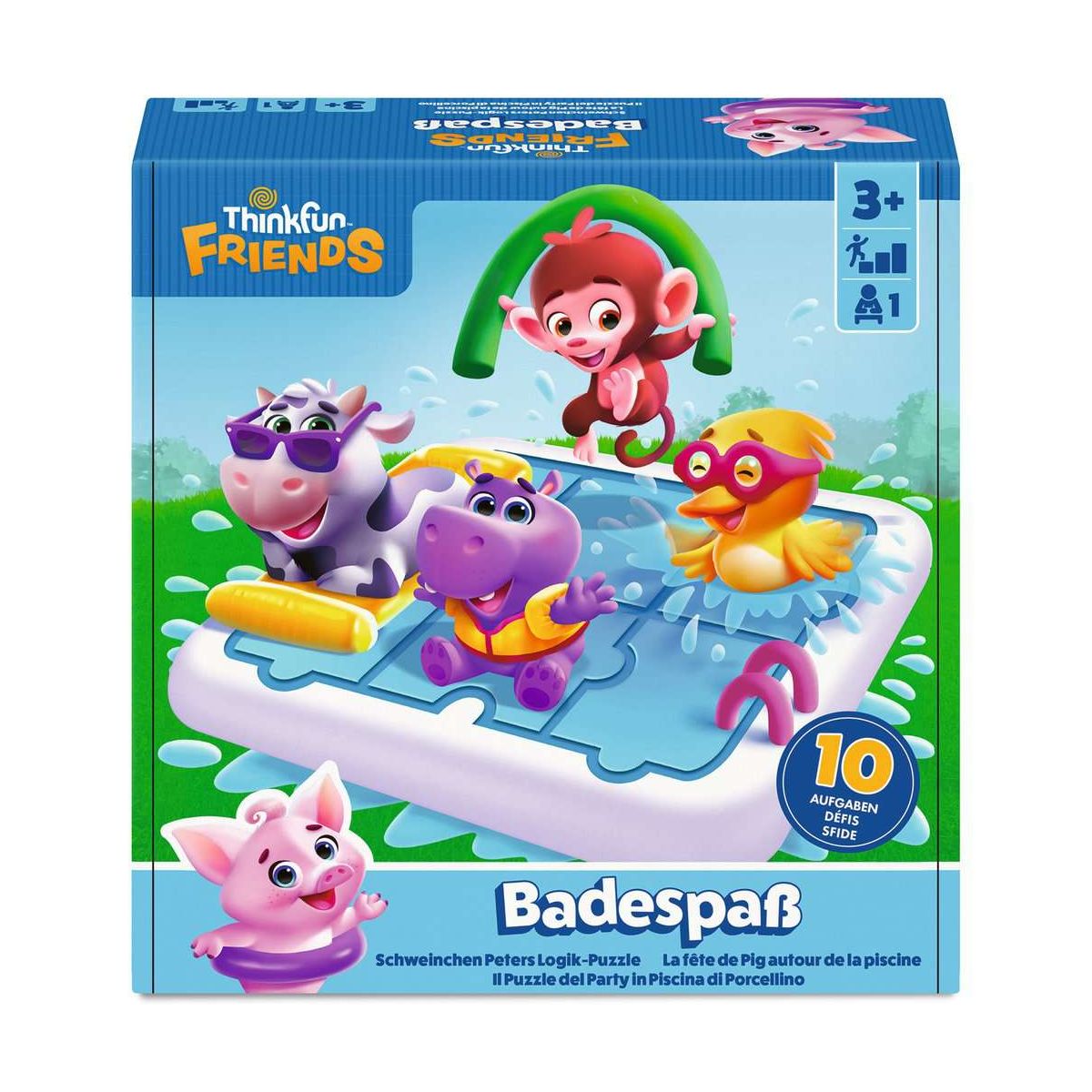 Schweinchen Peter braucht dringend Hilfe, damit all seine Freunde gemeinsam in den Pool passen. Zum Glück hat Peter eine besondere Superkraft: Geduld. Diese wird nützlich sein, wenn seine Pool-Party zu einem kniffligen Knobelspaß wird. Wie passen alle Freunde mit ihren Schwimmreifen gleichzeitig in den Pool? Setze deine eigene Geduld, Ausdauer und Problemlösungsfähigkeiten ein, um die Aufgaben zu lösen, damit die Freunde gemeinsam beim Schwimmen Spaß haben können!Die Thinkfun Friends verbringen ihre Tage in Puzzleville, wo sie spielen und gemeinsam Rätsel lösen. Jeder der Freunde hat eine besondere Denkfähigkeit, die ihnen wie eine Superkraft hilft. Zusammen sind sie großartig darin, jede Herausforderung zu meistern. In jedem Thinkfun Friends Spiel werden Kinder dazu eingeladen, mitzumachen, ihrer Fantasie freien Lauf zu lassen und gemeinsam mit den Thinkfun Friends zu üben. Durch Logik und Knobeleien überwinden sie alle Probleme, die ihnen begegnen.Die Spieler schieben eine Aufgabenkarte in die Pool-Basis und platzieren einige der Freunde, wie vorgegeben, im Pool. Doch wo haben die restlichen Freunde ihren Platz? Nun sind Problemlösungsfähigkeiten und Konzentration gefragt. Erst wenn alle Freunde zusammen im Pool sind und keine Lücken sichtbar sind, ist die Aufgabe gelöst!.