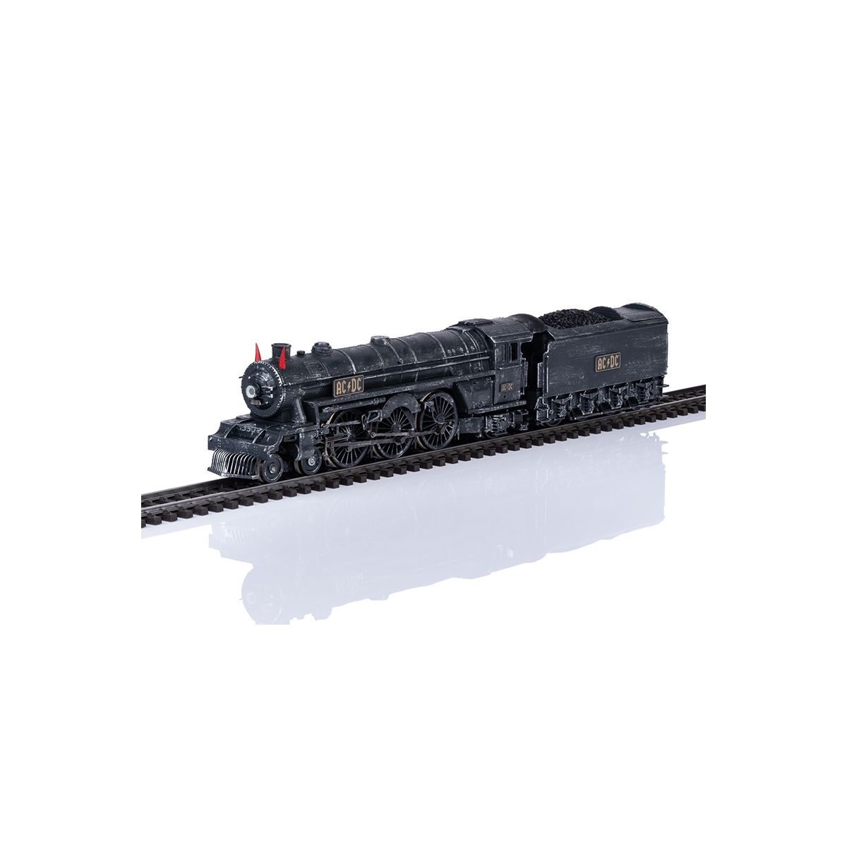 Modell: Mit Digital-Decoder mfx+ und umfangreichen Licht- und Soundfunktionen. Geregelter Hochleistungsantrieb mit Schwungmasse im Kessel. Drei Achsen angetrieben. Haftreifen. Lokomotive und Tender weitgehend aus Metall. Serienmäßig eingebauter Raucheinsatz, mit geschwindigkeitsabhängigem, dynamischem Rauchausstoß, digital schaltbar. Frontscheinwerfer mittig auf der Rauchkammertür der Lok und eine Lampe an der Tenderrückseite konventionell in Betrieb, digital schaltbar. Die Beleuchtung des Frontscheinwerfers kann auf rot umgeschaltet werden. Die AC/DC typischen Teufelshörner sind beleuchtet und können digital zugeschaltet werden. Führerstandsbeleuchtung und Feuerbüchsenflackern digital schaltbar. Beleuchtung des Tender-Durchgangs digital schaltbar. Beleuchtung mit wartungsfreien warmweißen und roten Leuchtdioden (LED). Verstellbare Kurzkupplung mit Kinematik zwischen Lok und Tender. Am Tender kinematikgeführte Kurzkupplung mit NEM-Schacht. Pufferhöhe an Lok und Tender nach NEM. Bremsschläuche, Schraubenkupplungsimitationen und geschlossene Zylinderdeckel liegen bei. Länge über Puffer ca. 24,5 cm.