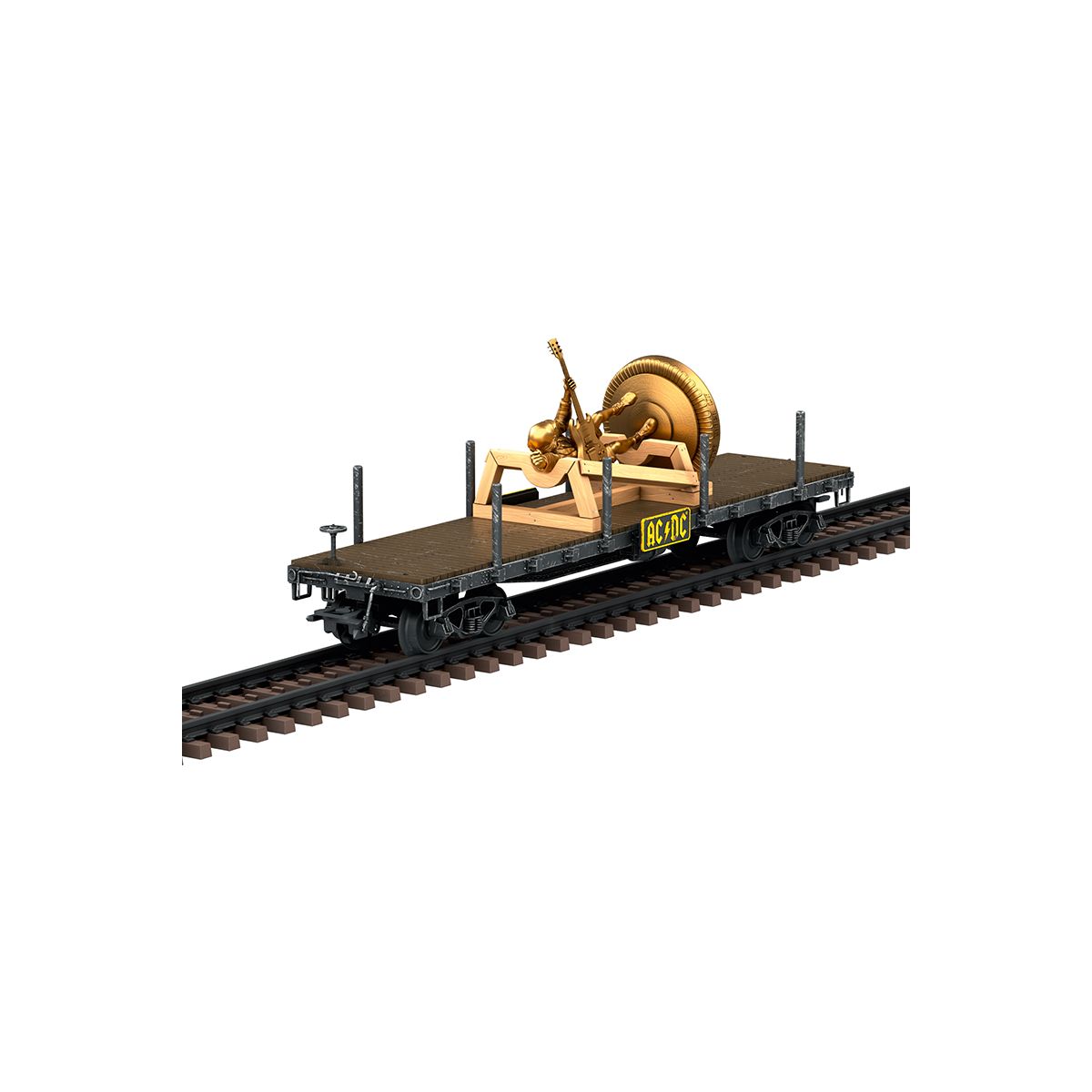 Modell: Flachwagen in Metall-/Kunststoff-Kombination. Wagen-Boden mit separat angesetzten Luftbehältern und Bremsleitungen. Am Wagen-Aufbau Bremsräder und angesetzte Haltegriffstangen. Separat einsteckbare Rungen liegen dem Wagen im Flachbeutel bei. Der Wagen ist mit einer Statue beladen. Zur Fixierung liegt ein passendes Ladegestell bei. Kulissengeführte Kupplungsdeichseln mit NEM-Normschacht. Länge des Flachwagens ca. 15 cm. Gleichstromradsatz E700580.