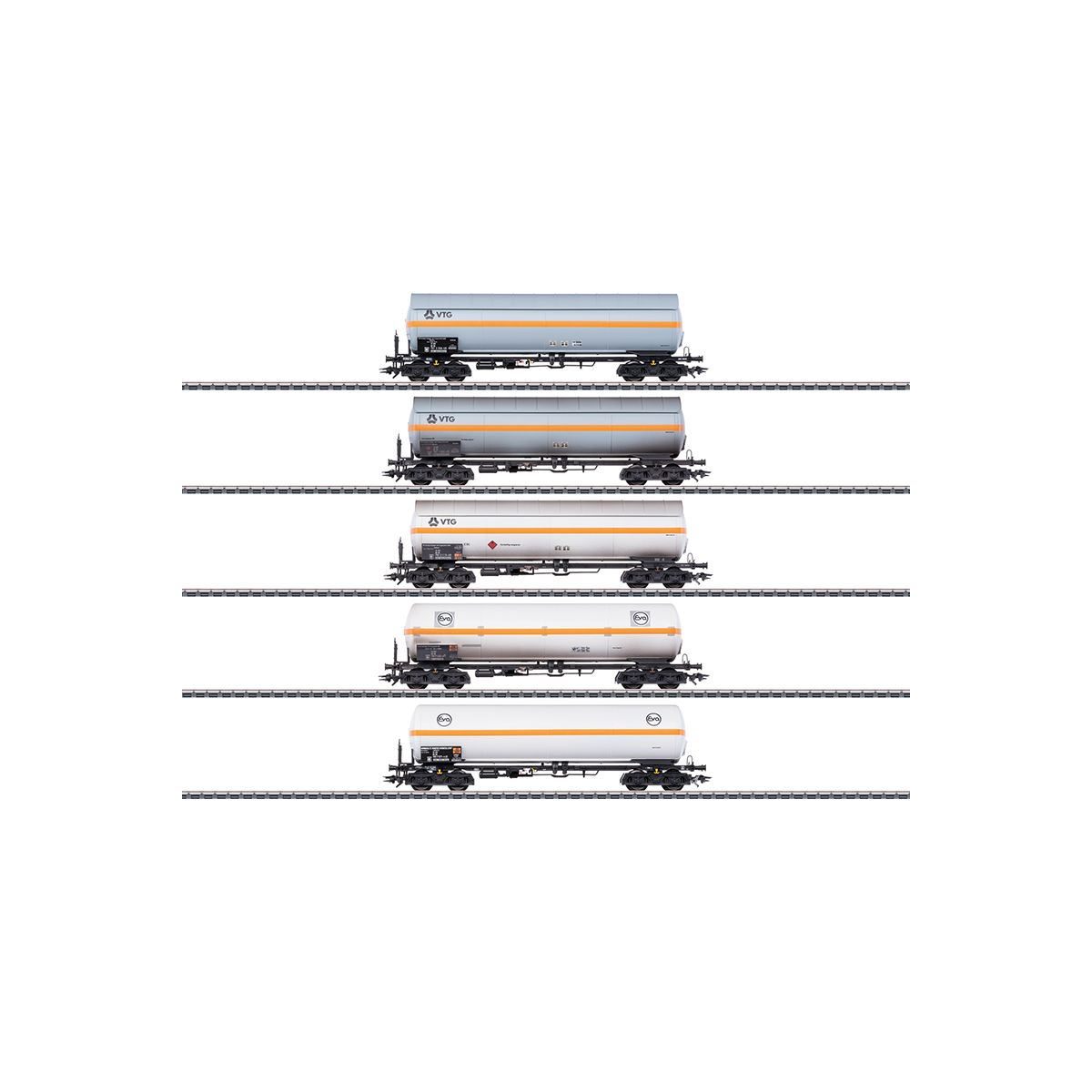 Vorbild: 5 vierachsige Druckgas-Kesselwagen mit und ohne Sonnenschutzdach. Privatwagen der VTG Vereinigte Tanklager und Transportmittel GmbH, Hamburg, mit Sonnenschutzdach. Privatwagen der Eva Eisenbahn-Verkehrsmittel AG, Düsseldorf, ohne Sonnenschutzdach. Betriebszustand um 1984.
