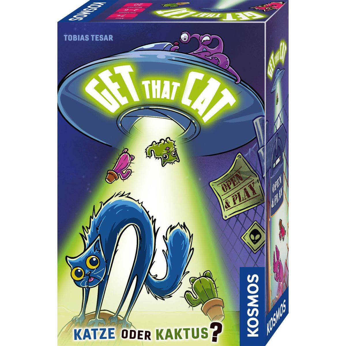 Achtung, Katze oder Kaktus? Auf Kommando decken die Spielerinnen und Spieler gleichzeitig die Karten auf. Jetzt genau hinschauen! Wo stecken die Katzen? Schnell die passende Ufo-Scheibe zum richtigen Zeitpunkt in die Box werfen, um die Katzen mit dem Lichtstrahl einzusammeln. Doch aufgepasst: Unter die Katzen haben sich ganz unauffällig Kakteen gemischt, die keine Punkte geben und natürlich auch nicht ins Ufo gehören. Wer schafft es, die meisten Katzen einzusammeln? In diesem lustigen Reaktionsspiel sind Schnelligkeit, Konzentration und Geschick gefragt. Ein blitzschnelles Reisespiel und Mitbringsel für Zwischendurch im Open Play-Format ab sieben Jahren. Rasanter Spielspaß für zwei bis sechs Personen..