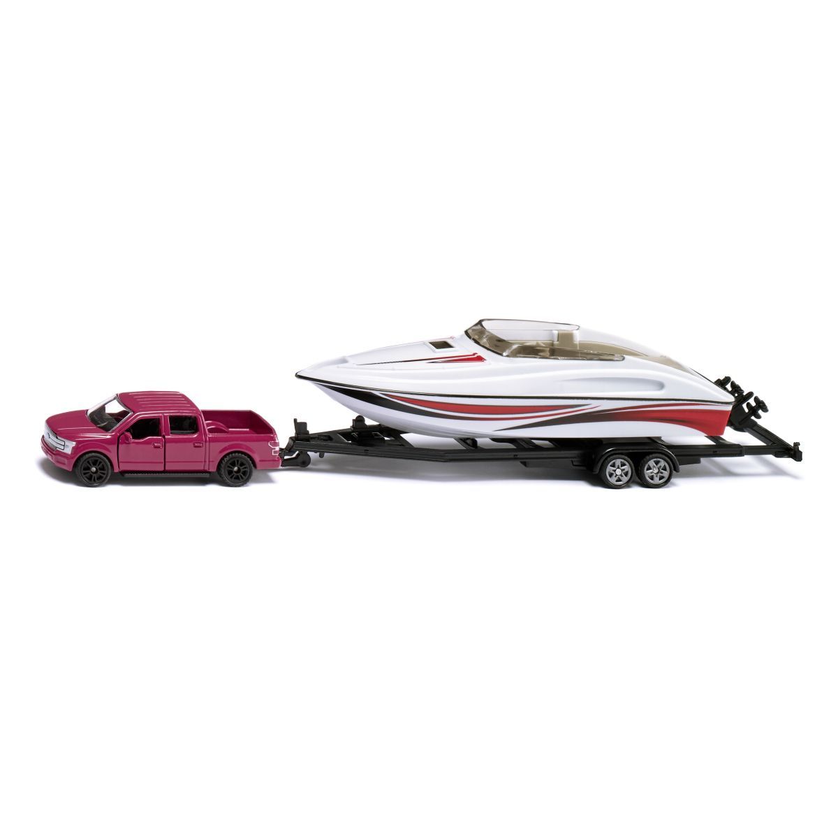 Der Ford F-150 ist der Inbegriff des „American Way of Life und begeistert seit über 30 Jahren als meistverkauftes Fahrzeug in den USA. Dieser kraftvolle Pick-up ist groß, robust und vielseitig – perfekt für jedes Abenteuer. Mit diesem Spielzeugset wird der ikonische Ford F-150 in einer spannenden Kombination geliefert: Ein starkes Motorboot reist auf einem stabilen Anhänger mit und sorgt für endlosen Spielspaß auf dem Kinderzimmer-Teppich! Der Ford F-150 beeindruckt mit seinem authentischen Design, gummierten Reifen und einer markanten Ladefläche, die jede Menge Platz für Fantasie-Abenteuer bietet. Natürlich verfügt der Pick-up auch über eine Anhängerkupplung, mit der der hochwertige Anhänger sicher verbunden wird. Das Boot selbst ist eine detailgetreue Nachbildung mit einer glänzenden Lackierung und realistischen Elementen, die Kindern das Gefühl geben, mitten im Abenteuer zu sein. Das Motorboot ist nicht nur optisch ein Highlight – es ist sogar schwimmfähig! Ob auf dem Spielteppich oder in der Badewanne, das Boot bringt Spaß auf jeder „Wasserstraße. Mit seinem robusten Tandem-Achs-Trailer aus Metall lässt es sich leicht ankuppeln und sicher transportieren. Ob Ausflug zum See, ein spannendes Bootsrennen oder ein Roadtrip durch die weite Prärie – mit dem Ford F-150 und seinem Motorboot gibt es für kleine Abenteurer immer etwas zu entdecken. Gefertigt aus hochwertigen und sicheren Materialien, sorgt dieses Spielzeug für langanhaltenden Spaß und ist ein Must-have für jeden kleinen Auto- und Boots-Fan!.