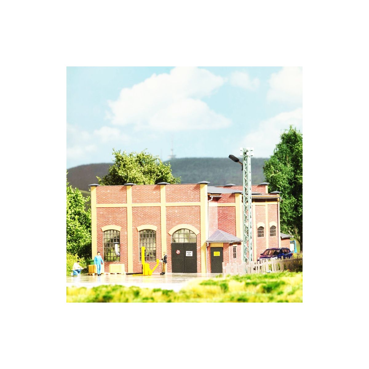 Bausatz für ein authentisches Fabrikgebäude aus der Jugendstilepoche. Als Vorbild dient das Kraftwerk Kammerl in Oberbayern, das nach seiner Renovierung nun wieder mit dem ursprünglich verwendeten, ziegelroten Mauerwerk erstrahlt. Fassade mit detailreicher Verarbeitung auf allen Gebäudeseiten. Die halbrunden Fensterstürze sind ebenso typisch für die damalige Architektur wie die klassischen Sprossenfenster mit filigranen Holzrahmen und die großen Holztore (alles Echt-Holz). Vielseitig einsetzbar als Industrie-, Handwerks- und Maschinengebäude oder Loft. Vorbereitet für den Einbau einer Innenbeleuchtung z.B. mit Busch LEDs 5998. Größe: 165 x 149 mm, 82 mm hoch. Hier wird gestanzt, lackiert, gelasert und gedruckt! Die alte Fabrikhalle ist schon über 100 Jahre alt aber in Top-Zustand. Unter ihrem Dach befindet sich eine moderne Produktionsanlage mit Büros. Für die Inneneinrichtung der einzelnen Abteilungen und Büros haben wir passende Action Sets (79903 - 79907) entwickelt, die sehr realistisch die einzelnen Maschinen und Mitarbeiter darstellen. Diese Fabrik ist ein Schmuckstück auf jeder Modellanlage! Durch einen stabilen, zusammensteckbaren Unterbau, der mit den fertig geschnittenen und kolorierten Teilen verkleidet wird, ist der Zusammenbau besonders einfach. Zusätzlich sind lediglich ein Bastelmesser und Modellbaukleber (z.B. Busch 7599) oder Alleskleber (z.B. UHU Kraft) erforderlich..