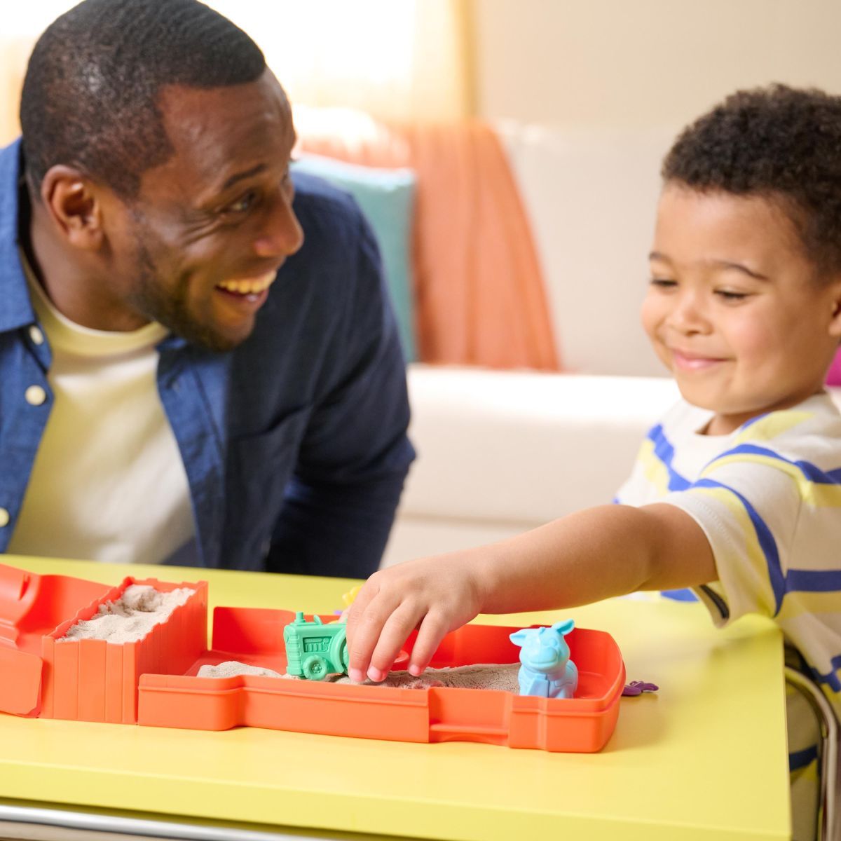 Sandspielen gehört zu den Grundbedürfnissen von kleinen Kindern. Das Formen fördert die Entwicklung der Feinmotorik, das Förmchenspiel die Augen-Hand-Koordination und die körnige Haptik den Tastsinn. Damit diese einfache Lernförderung nicht dem Spielplatz überlassen bleibt, bietet Kinetic Sand mit seiner besonderen Struktur die positiven Elemente des Sandspiels für drinnen und legt noch eine Schippe drauf. Da Kinetic Sand an sich selbst haftet und nicht an den Händen, lässt er sich nicht nur besonders gut formen und modellieren, sondern auch kinderleicht aufräumen. Einfach eine Kugel aus Kinetic Sand formen und Reste damit auftupfen. Das Sandy Farm Set bietet aufgeklappt eine schöne Spielfläche mit Beetbereich zum Pflanzen und Ernten der enthaltenen Gemüsestecker. Natürlich können hier auch andere Gemüse aus dem Kaufmannsladen oder selbst gebastelt verwendet werden. Mit Kuh und Huhn können die KInder Fußspuren in den Sand stempeln und mit dem Traktor erste Zahlen lernen. Da Kinetic Sand nicht austrocknet, kann die Box auch über Nacht offen gelassen werden, damit das Spielen am Morgen gleich weitergehen kann. Für längere Spielpausen lassen sich Sand und Zubehörteile in der Box aufbewahren, die Dank ihrer kompakten Größe in jedes Regal passt. Kinetic Sand gibt es als Nachfüllpacks in vielen verschiedenen Farben für noch mehr fantasievollen Spielspaß..