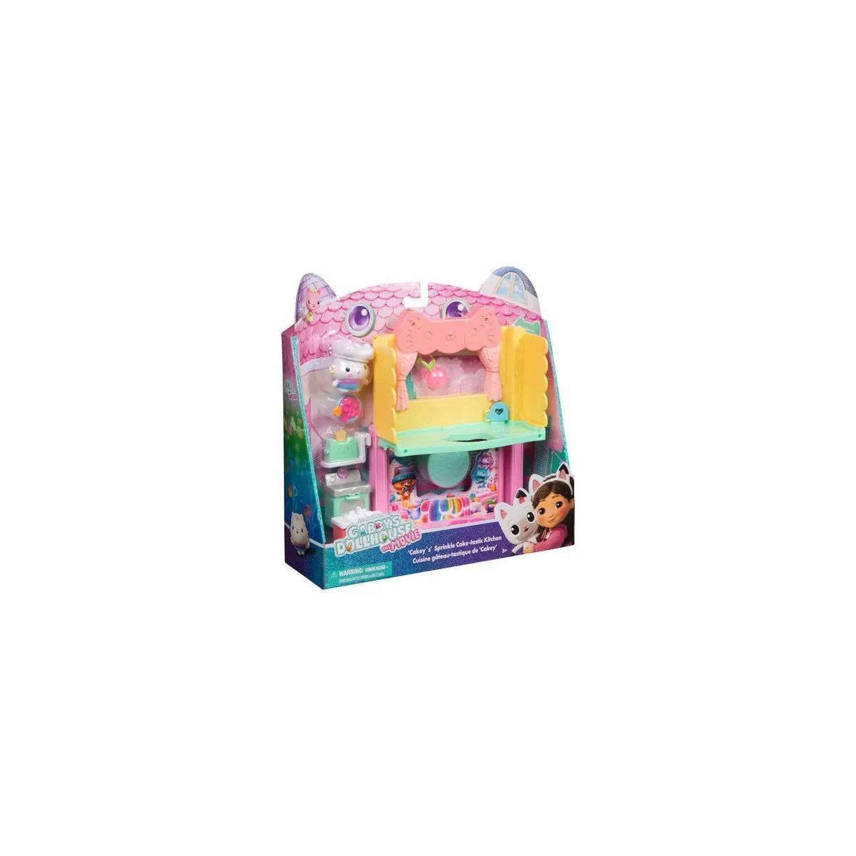 Bereit für zuckersüße Abenteuer? Mit Kuchis Sprinkle Cake-tastic Kitchen Portal Raum wird das magische Film-Universum von Gabby’s Dollhouse: Der Film lebendig! Dieses liebevoll gestaltete Spielset mit 10 Teilen bringt nicht nur die beliebte Figur Kuchi (EN: Cakey), sondern auch 8 Möbel- und Küchenzubehörteile mit – perfekt für fantasievolle Backabenteuer im Puppenhaus. Das Highlight: Die Küche lässt sich an das Puppenhaus anstecken und verwandelt sich in einen zweistöckigen Raum mit einer Überraschungsfunktion! Setze Kuchi auf die Plattform in der Mitte und ziehe den Raum nach unten – schon wird Kuchi wie im Film in seine traumhafte Zuckerwelt teleportiert! Wie in der Serie gibt’s auch hier wieder eine Dollhouse Delivery zu entdecken – einfach auspacken und das Überraschungszubehör entdecken. Danach den QR-Code scannen, um eine weitere Überraschung in der Gabby’s Dollhouse App freizuschalten. Ob als Geschenk oder Erweiterung für das bestehende Puppenhaus – dieses Set lädt Kinder ab 3 Jahren zu stundenlangem Rollenspiel ein und ist ein Muss für alle kleinen Gabby-Fans..