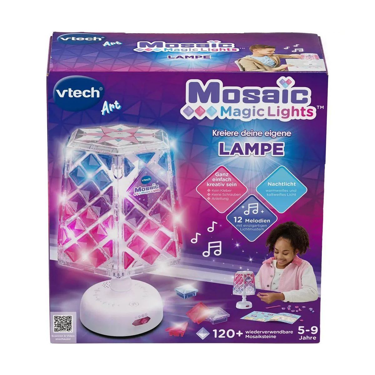 Die Mosaic Magic Lights - Lampe bringt buntes Licht, zauberhafte Melodien und Kreativität ins Kinderzimmer! Die kreative Lampe lässt sich individuell mit bunten Mosaiksteinen gestalten, sodass eine eigene, einzigartige Lichtquelle erschaffen werden kann, die zudem auch Melodien abspielt und zauberhafte Lichtmuster entstehen lässt! 3 Spielmodi: Lichtmustermodus, Nachtmodus und statischer Modus zum Lesen. Mit den bunten Mosaiksteinen kann die Lampe ganz nach eigenen Vorstellungen dekoriert werden und jede Lampe wird so zu einem individuellen Kunstwerk. Unendlich personalisierbar: Spatel ermöglicht es, die Steine leicht zu entfernen. Lerninhalte: Kreativität und Feinmotorik. Mehr als 120 bunte Mosaiksteine und 1 Mosaikstein mit Logo. Musiktaste zum Ein- und Ausschalten der Musik. Touchsensor zum Einstellen der Lichteffekte und Auswählen der Lieder. USB-C Anschluss. 12 verschiedene Melodien aus unterschiedlichen Musikrichtungen verwandeln das Zimmer in eine fröhliche Spiel- und Entspannungszone. Kindersicheres Batteriefach und Abschaltautomatik..