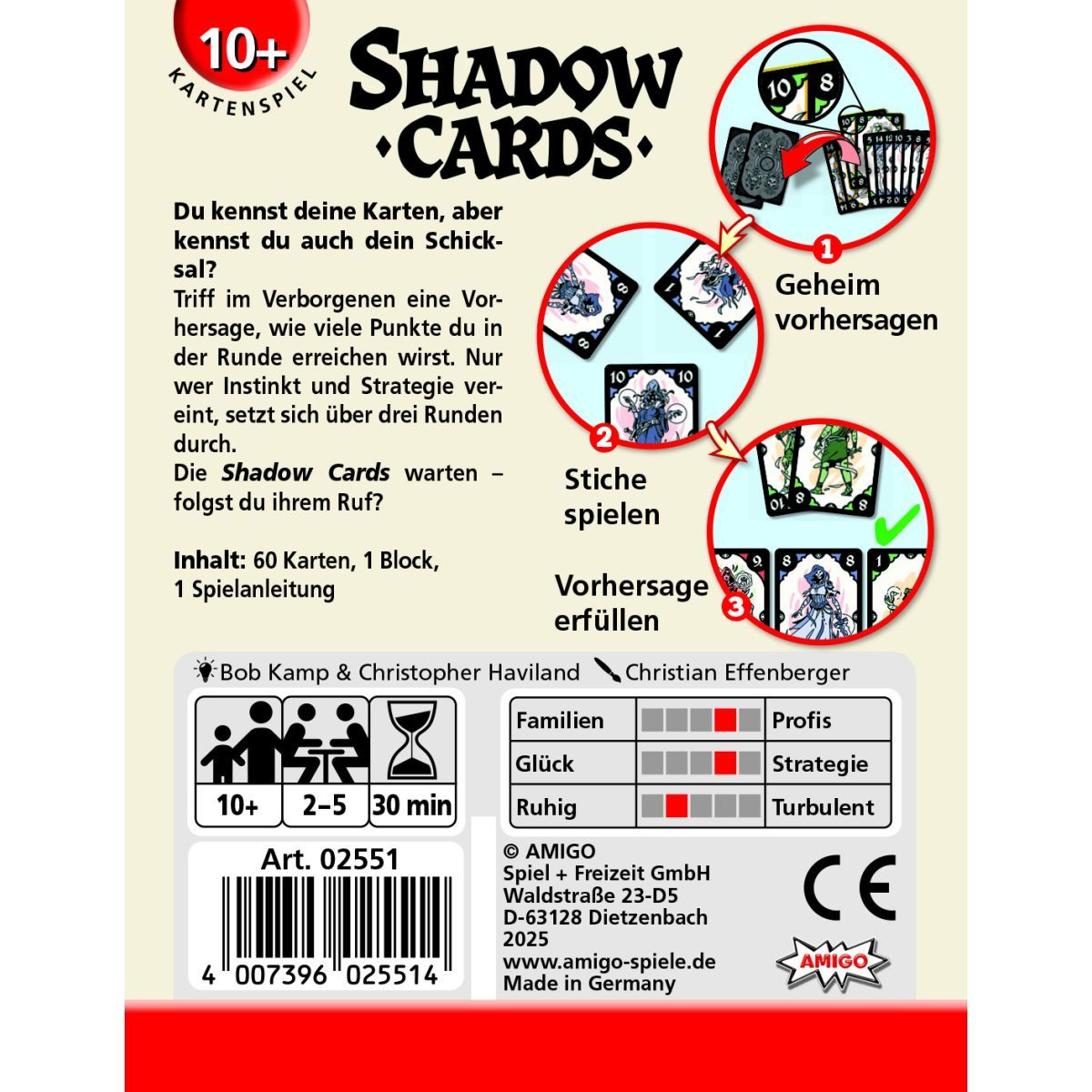 Shadow Cards MBE3 Bei Shadow Cards geben die Spielenden im Verborgenen eine Vorhersage ab. Vor jeder Stichrunde werden dafür zwei der eigenen Handkarten ausgewählt, deren Wert die zu erzielenden Punkte vorgeben. Gewinnt man einen Stich, kommt man der eigenen Vorhersage näher. Nur wer Instinkt und Strategie vereint, setzt sich nach drei Runden durch und kann am Ende gewinnen. Ein abwechslungsreiches Stichspiel, das auch für 2 Personen gut geeignet ist. So spielt man Shadow Cards MBE3: * Mischt und verteilt alle Karten, so dass alle gleich viele Handkarten haben. * Vor der aktuellen Stichrunde sagt ihr mit zwei Karten geheim vorher, wie viele Stichpunkte ihr gewinnen wollt. * Die zuerst ausgespielte Farbe muss bedient werden. Wer nicht bedienen kann, muss abwerfen oder trumpfen. Rot ist immer Trumpf. * Wer den Stich gewinnt, sucht sich davon eine Karte aus. Ihr Wert sind die gewonnenen Stichpunkte. * Nachdem ihr alle Stiche gespielt habt, vergleicht ihr eure Vorhersage mit all euren gewonnenen Stichpunkten. * Je besser ihr eure Vorhersage erfüllt, desto mehr Punkte erhaltet ihr. * Wer nach drei Runden die meisten Punkte hat, gewinnt. Inhalt: * 60 Karten * 1 Block * 1 Spielanleitung Maße: 12,2 x 9,5 x 2 cm Autor: Bob Kamp Grafik: Christian Effenberger Erfolgsfaktoren: * Stichspiel mit leicht gehobenem Anspruch, ideal für Wizard-Fans * Fantasievolle Illustrationen für ein tieferes Spielerlebnis * Stufenweise Regeleinführung für einen einfachen Spieleinstieg * Auch zu zweit gut spielbar.