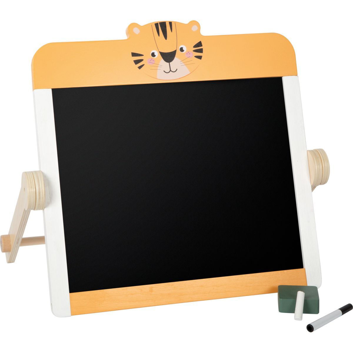 Doppelter Mal- und Schreibspaß fürs Kinderzimmer! Mit dieser liebevoll gestalteten 2-in-1 Kreide- und Magnettafel wird jeder Tisch zur kreativen Spielwiese. Die beidseitig nutzbare Tischtafel aus robustem, Holz lädt Kinder dazu ein, immer neue Bilder zu malen, Buchstaben zu üben oder erste Rechenaufgaben zu lösen. Eine Seite wird klassisch mit Kreide beschrieben, die andere verwandelt sich mit dem praktischen Boardmarker in ein Whiteboard – perfekt für vielseitigen Lern- und Spielspaß. Mit dabei: weiße Kreide, ein Boardmarker und ein leicht zu haltender Schwamm mit Holzgriff, der ideal in kleine Kinderhände passt. So kann der Spaß sofort beginnen! Besonders charmant ist das süße Safari-Tiger-Design, das die Fantasie beflügelt und zu immer neuen Rollenspielen rund um Kindergarten, Schule und Unterricht einlädt. Dank des beweglichen Standrahmens lässt sich die Tafel kinderleicht auf dem Tisch aufstellen und bei Bedarf platzsparend verstauen. Ob im Kinderzimmer, Wohnzimmer oder unterwegs – diese Lerntafel sorgt überall für kreative Beschäftigung. Die kombinierte Kreide-, Whiteboard- und Magnettafel vereint stabiles Holzspielzeug mit durchdachtem Zubehör und pädagogischem Mehrwert. Sie ist eine sinnvolle Ergänzung für die Spiel- und Lernwelt zu Hause und kommt mit allem Zubehör, um direkt loszulegen – ready to play!.