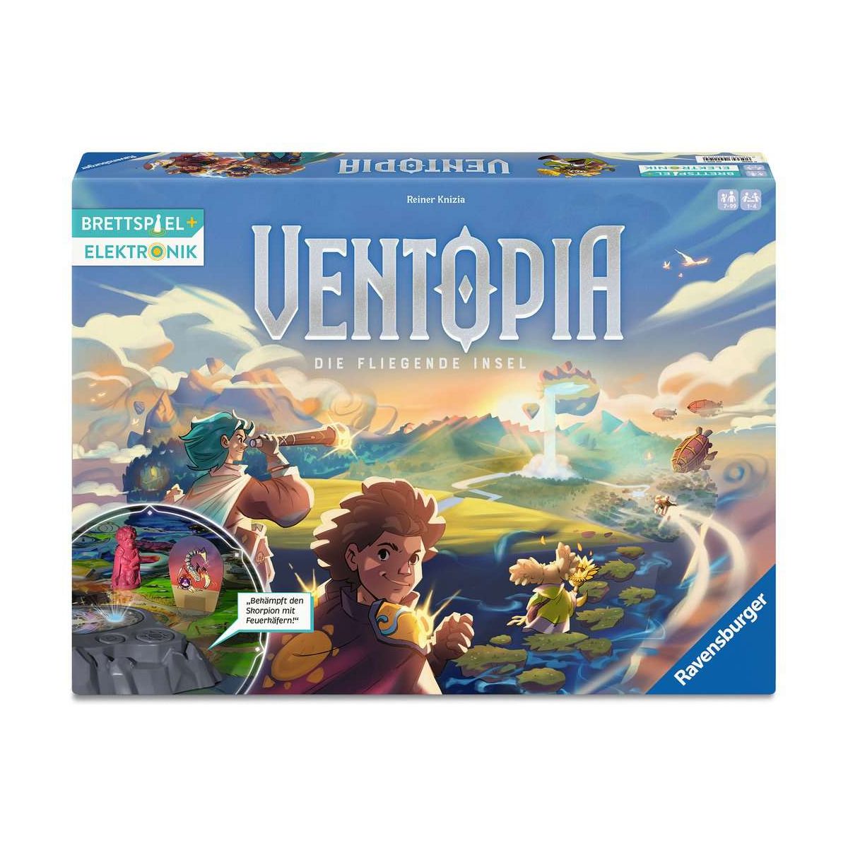 Ventopia ist ein Spiel mit elektronischem Spielplan, das ein fantastisches Abenteuer bietet. Auf der fliegenden Insel Ventopia ist der schützende Lichtschild zusammengebrochen. Nyxara, die Herrscherin der Dunkelwelt möchte Ventopia unter ihre Kontrolle bringen und schickt ihre dunklen Kreaturen aus. Schaffen die Mitspielenden mit Kampfgeschick und Sammelglück die fliegende Insel vor dem drohenden Absturz in die dunkle Tiefe zu bewahren? Hoch hoch hinauf! Hinauf auf die fliegende Insel Ventopia. Dort stellen sich die Mitspielenden der Herausforderung, die fliegende Insel Ventopia zu retten. Diese wird von der Herrscherin der Dunkelwelt und ihren dunklen Kreaturen bedroht. Es gilt geschickt zu kämpfen, zu sammeln und die drei Energie-Türme zu reparieren. Ob gemeinsam oder gegeneinander, die Elektronik im Spielplan bietet unterschiedliche Schwierigkeitsstufen. Der Spielablauf wird gesteuert, so dass jedes Spiel anders verläuft. Es ist immer wieder aufs Neue spannend und herausfordernd. Die Soundwelt untermal das Abenteuer auf Ventopia auf einzigartige Weise. Im Tutormodus wird das Spiel Stück für Stück erklärt, somit können Kinder ab 7 Jahren sofort losspielen und in die fantastische Welt von Ventopia eintauchen. Ein perfektes Spiel für alle abenteuerliebenden Personen, die Lust auf eine neue Art von Brettspiel haben..