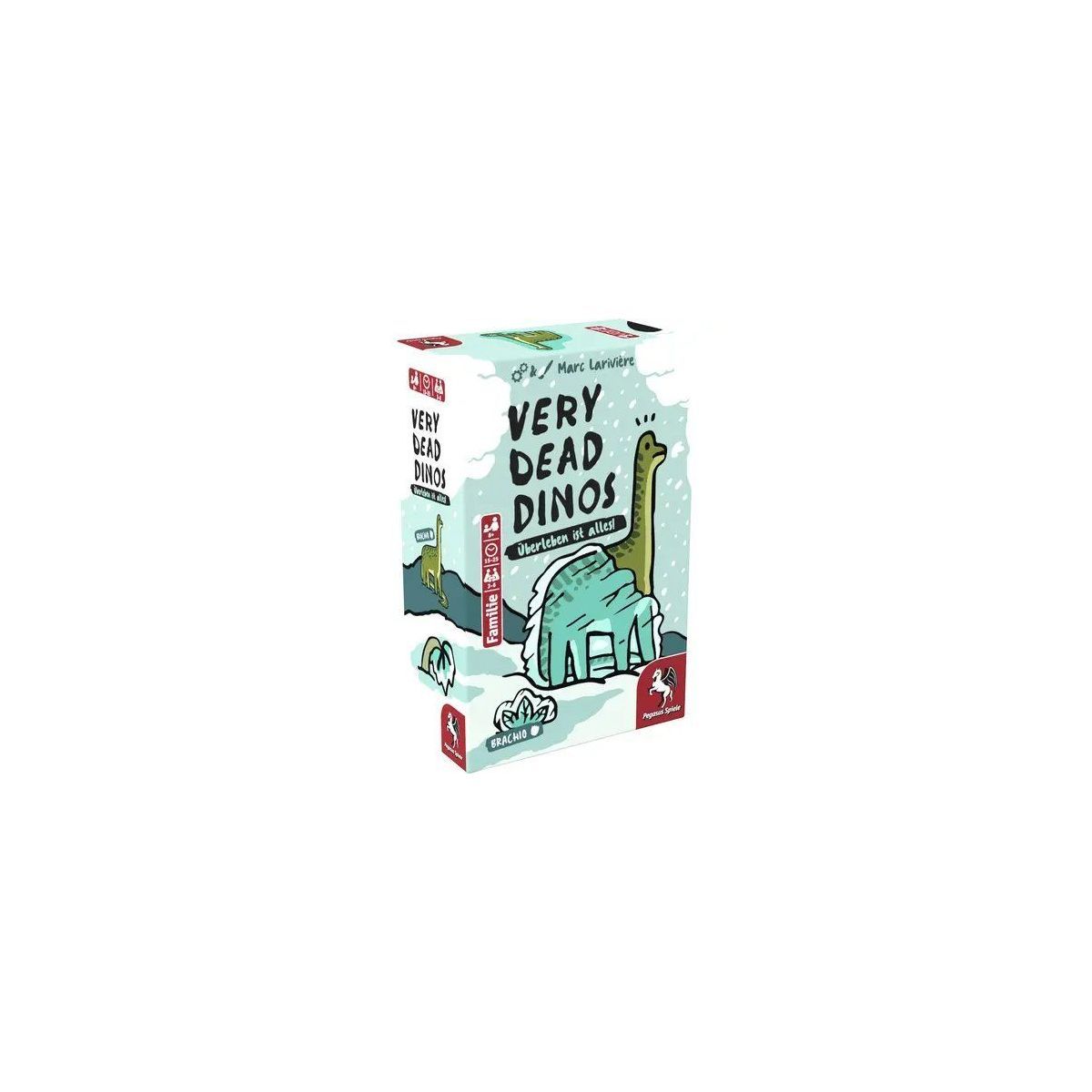 In einem Land, lange vor unserer Zeit gab es einst viele verschiedene Dinos mit unterschiedlichen Fähigkeiten. Doch sie hatten es nie einfach, ein Desaster jagte das andere und um die eigene Haut zu retten, muss man eben manchmal über Dino-Leichen gehen. In Very Dead Dinos werden die Spielenden zu Dinos. Ihr Ziel: in einer Welt voller Desaster möglichst lange überleben. Die jeweiligen Desaster-Karten mit Werten von 1-11 stellen die Dinos vor bestimmte Herausforderungen, auf die sie unterschiedlich gut vorbereitet sind. Daher hat jede*r die Möglichkeit, die eigene, zufällig zugeteilte Desaster-Karte zu tauschen – entweder mit der aufgedeckten Karte im Fluss oder mit dem Dino zur Linken. Anschließend decken alle gleichzeitig ihre Desaster-Karten auf und die Karten werden verglichen: Die Person mit dem niedrigsten Wert verliert ein Leben. Effekte auf Dino- und Desaster-Karten können dies aber manipulieren und vielleicht sogar einen anderen Dino ins Verderben stürzen ... Sobald eine Person drei Leben verloren hat, endet die Partie: Die anderen Dinos überleben und dürfen sich über ihren Sieg freuen! Very Dead Dinos (Brachio) und Very Dead Dinos (T-Rex) beinhalten unterschiedliche Kartensets, spielen sich aber nach denselben Regeln. Beide Titel sind miteinander kompatibel..