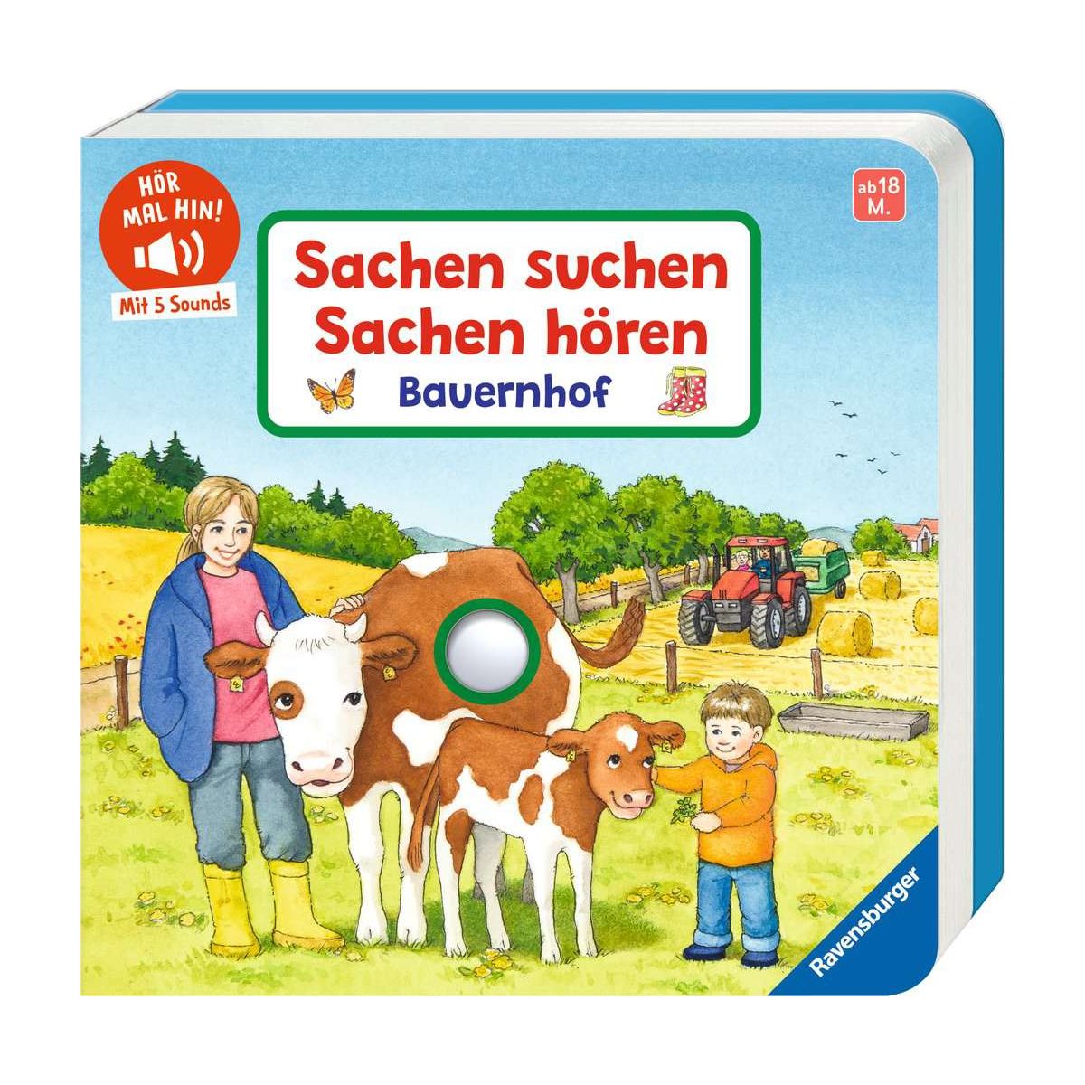 Das beliebte Sachen suchen kombiniert mit 5 spannenden SoundsDer Hund bellt, der Hahn kräht und der Traktor tuckert: Auf dem Bauernhof gibt es viele interessante Geräusche. Hörst du das laute Krähen des Hahns? Einfach leicht auf den Knopf drücken, schon erklingt der passende Sound. Und wer genau hinschaut, entdeckt auf jeder Seite viele kleine Bilder vom Seitenrand wieder. Und wenn mal Ruhe herrschen soll? Dann lässt sich die Soundfunktion auf der Rückseite des Buches ganz einfach ausschalten.Kuh Elsa ist heute mit ihrem Kälbchen auf der Weide und muht laut. Vor dem Hofladen begrüßt Hund Felix bellend die Kinder. Das Schwein grunzt vergnügt und freut sich auf sein Futter. Vor dem Hühnerstall kräht der Hahn fröhlich. Und der Traktor fährt mit brummendem Motor über das Feld.Die Lautstärke der Geräusche in diesem Ravensburger Pappbilderbuch ist an das empfindliche Gehör von Kleinkindern angepasst. Zusätzlich lässt sich die Soundfunktion auf der Rückseite des Buches an- und ausschalten. Das Buch ist sofort einsatzbereit. Es enthält zwei für Kinder nicht zugängliche AAA-Batterien, die bei Bedarf mit Hilfe eines Kreuzschraubendrehers ausgetauscht werden können..