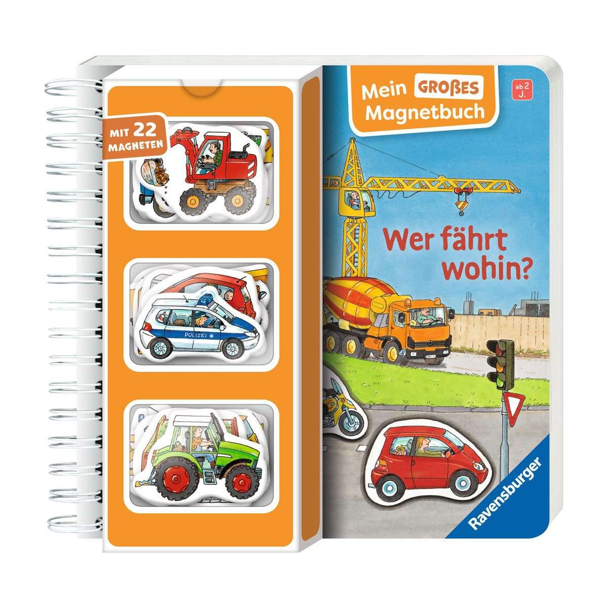 So viele Fahrzeuge!Traktor, Betonmischer, Bagger oder Feuerwehrauto: Aus 22 Magneten können Kinder ab 2 Jahren die passenden Fahrzeuge auswählen. Auf der Ausklappseite hinten im Buch können alle Fahrzeuge noch einmal zusammen herumflitzen. Kurze Texte geben den Kindern Hinweise, wo welche Fahrzeuge hingehören. Die Buchseiten sind auf der ganzen Fläche magnetisch. So können die Magnetteile am richtigen Platz, aber auch ganz frei im Buch platziert werden. In diesem Spielbuch sind viele Fahrzeuge unterwegs. Der Traktor zieht den Ladewagen zum Bauernhof, auf der Baustelle muss ein Kran aufgebaut werden und das Feuerwehrauto rast zu einem Hausbrand. Kleinkinder können hier 22 Magnete den passenden Szenen zuordnen oder frei mit ihnen auf den magnetischen Buchseiten spielen. Das macht Spaß und fördert ganz nebenbei Feinmotorik und Kreativität. Die ausklappbare Doppelseite am Schluss bietet viele weitere Spielmöglichkeiten für die Fahrzeug-Magnete. Die Magnete haften an vielen magnetischen Flächen und können zum Beispiel auch an der Heizung oder dem Kühlschrank zum Spielen eingesetzt werden..