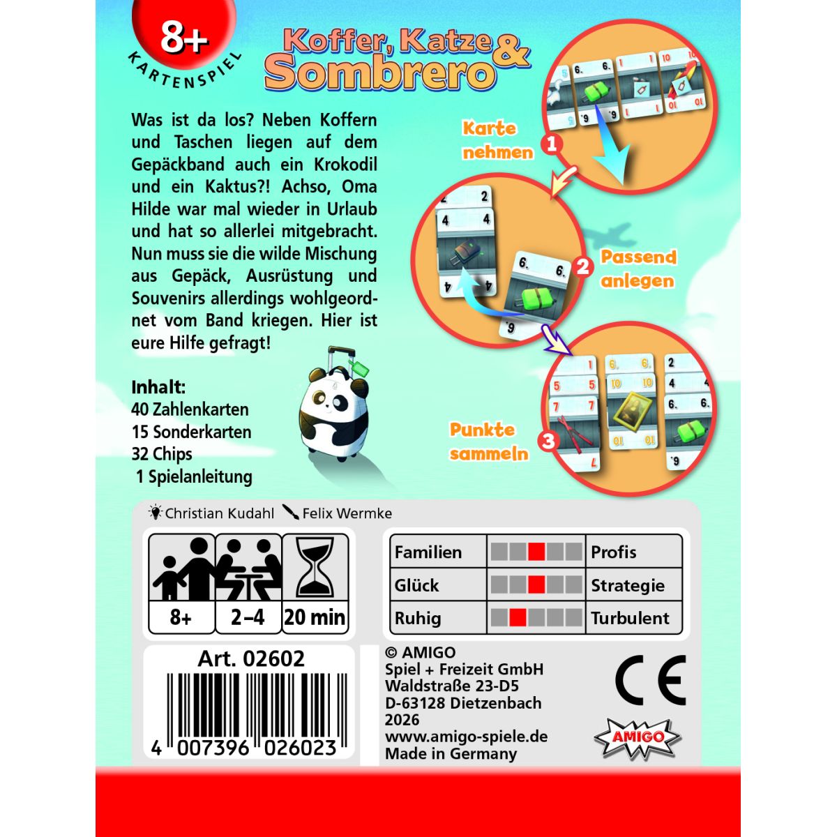 Koffer, Katze Sombrero MBE3 Was ist da los? Neben Koffern und Taschen liegen auf dem Gepäckband auch ein Krokodil und ein Kaktus?! Achso, Oma Hilde war mal wieder in Urlaub und hat so allerlei mitgebracht. Nun muss sie die wilde Mischung aus Gepäck, Ausrüstung und Souvenirs allerdings wohlgeordnet vom Band kriegen. Hier ist Unterstützung gefragt! Es gilt, möglichst viele Gepäckstücke nach Größe und Farbe sortiert zu sammeln, um die meisten Punkte zu machen. Wem das am besten gelingt, gewinnt nicht nur Oma Hildes Dankbarkeit, sondern auch dieses raffinierte Kartenspiel. So spielt man Koffer, Katze Sombrero MBE3: * Mischt die 40 Zahlenkarten und legt 7 Karten offen in einer Reihe in die Tischmitte. * Nehmt euch jeweils 7 Chips und legt sie als persönlichen Vorrat vor euch. * Bist du am Zug, führst du die folgenden 3 Schritte in dieser Reihenfolge aus: 1. Nimm dir eine Karte aus der Kartenreihe. Die erste Karte der Reihe kannst du einfach so nehmen. Möchtest du eine andere Karte nehmen, musst du einen Chip auf jede Karte legen, die du überspringst. 2. Lege genommene Karten in aufsteigenden Farbreihen offen vor dich. Kannst du nicht aufsteigend anlegen, musst du die Karte verdeckt legen – sie zählt dann am Ende einen Minuspunkt. Chips auf genommenen Karten legst du zu deinem eigenen Vorrat dazu. 3. Schiebe dann die Kartenreihe in der Tischmitte weiter und fülle sie wieder auf. Danach ist die nächste Person am Zug. * Das Spiel endet, sobald ihr die Kartenreihe nicht mehr auffüllen könnt. Zählt eure Punkte zusammen. Eine Karte gibt entsprechend ihres Zahlenwerts Punkte. * Mit 15 spannenden Sonderkarten für noch mehr Abwechslung und Spielspaß! Inhalt: * 40 Zahlenkarten * 15 Sonderkarten * 32 Chips * 1 Spielanleitung Maße: 12,4 x 9,6 x 2,1 cm Autor: Christian Kudahl Grafik: Felix Wermke Erfolgsfaktoren: * Ausgewogene Mischung aus Planung und Glück * Originelles Thema * Leichter Einstieg breite Zielgruppe.