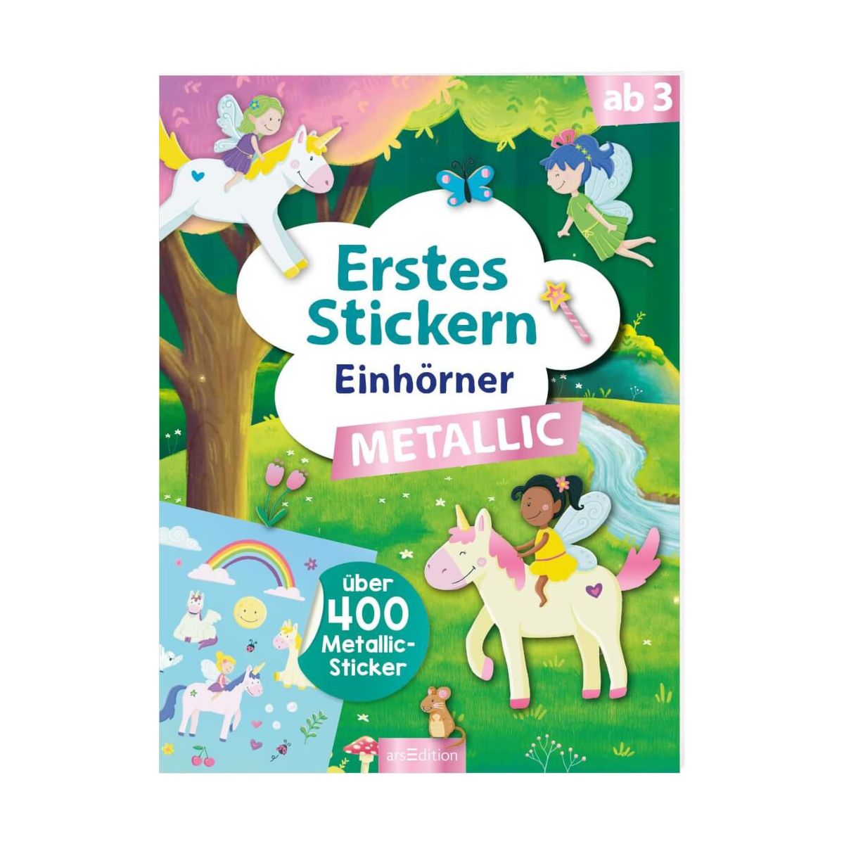 Für alle kleinen Einhorn-Fans. Tauche ein in die wunderbar schillernde Welt der Einhörner! Auf den bunt illustrierten Seiten gibt es jede Menge Szenen zu entdecken: von zauberhaften Wasserfällen über Regenbögen bis hin zu verwuschenen Wäldern. Wähle aus über 400 Aufklebern mit coolem Metallic-Effekt und erschaffe einzigartige schillernde Szenen. Metallic-Effekt: Die in 2 Farben glänzenden Sticker sind ein ganz besonderer Hingucker. Tolle Bilder: Die 14 Szenen sind bunt illustriert und laden zum Stickern ein. Viele Sticker: In das Stickeralbum integriert sind Stickerbögen mit über 400 Aufklebern. Die Bögen sind perforiert zum leichten Heraustrennen. Spannende Motive: Hier finden sich jede Menge Szenen zum Bestickern . Ideal als Geschenk oder Mitbringsel: Über dieses Buch freuen sich alle Kinder ab 3 Jahren. Stickerspaß mit dem besonderen Extra. Das großformatige Stickeralbum bietet jede Menge Raum, der Fantasie freien Lauf zu lassen und eigene, schillernde Szenen rund um das Thema Einhörner zu erschaffen..