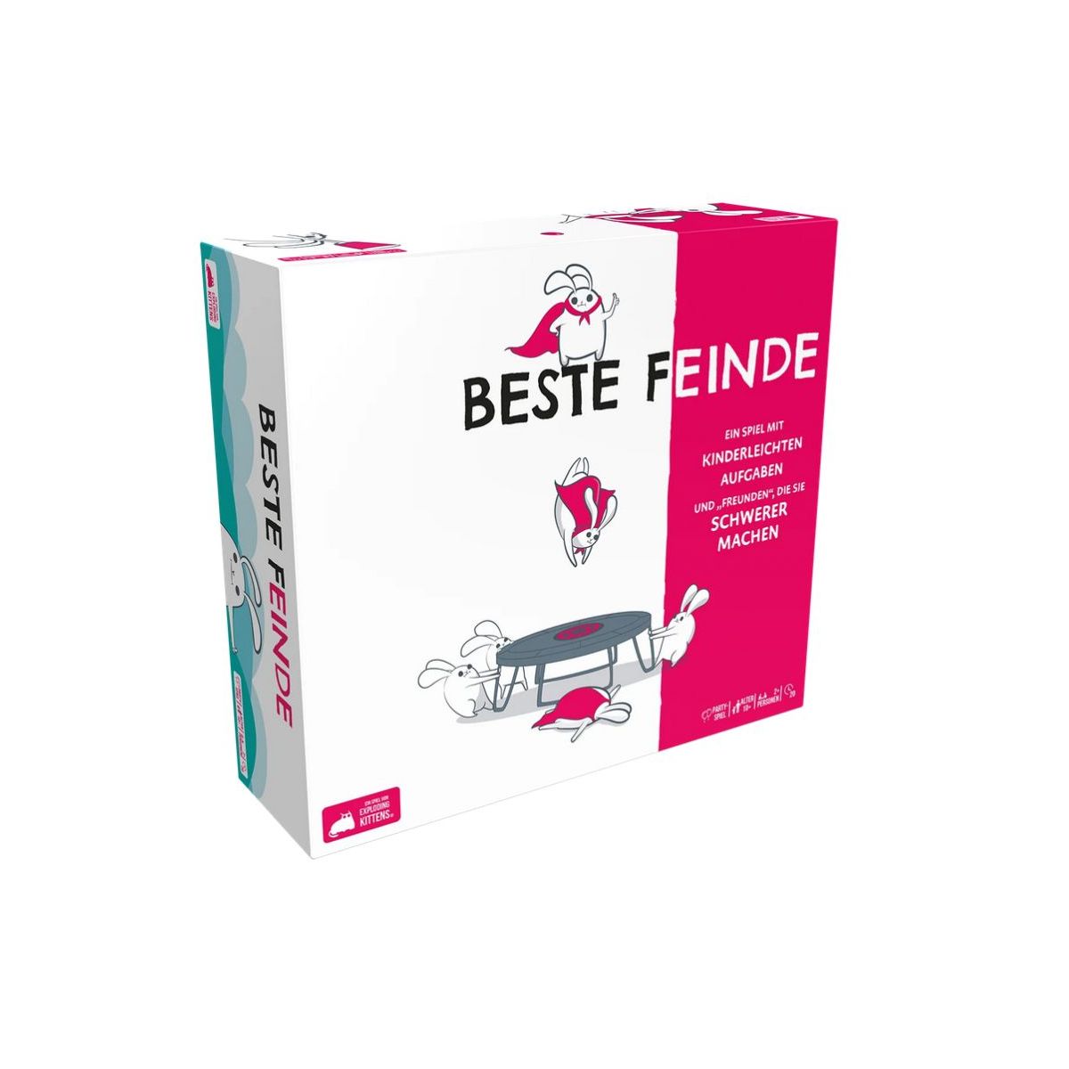 Beste Feinde ist ein actiongeladenes Partyspiel aus der Ideenschmiede der Exploding Kittens. Kurzgesagt musst du kinderleichte Aufgaben meistern. Der Haken dabei ist jedoch, dass diese von deinen gierigen „Freunden“ durch Bieten erschwert werden, ohne die Aufgaben wirklich zu kennen. Wer das höchste Gebot abgibt, wird dein Buddy und gewinnt oder verliert gemeinsam mit dir, je nachdem ob du deine absurde Herausforderung bewältigen kannst oder nicht. Witzige Materialien wie Becher, Ball und Augenbinde machen Beste Feinde zu einem spaßigen Chaos aus High-Five-Momenten, (Lach-)Tränen und Totalausfällen. Du packst das schon! Irgendwie…